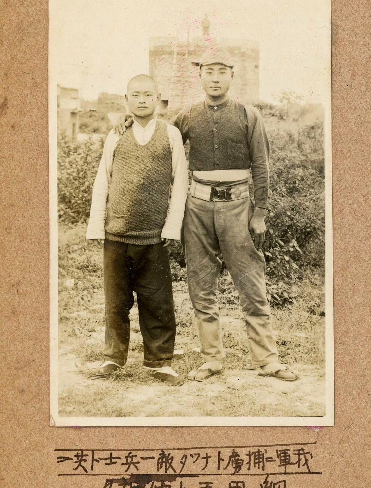 这是在日军相册中发现的一张照片。照片下方用日文写着:“我军捕虏敌军一名士兵”等字样。右边戴帽子应该是日军,左边光头的应该是我军。从哪里可以看出来呢?请注意看他们穿的鞋子,右边的人穿的是像牛蹄一样的两趾鞋,所以是日军。而左边的人穿的是布鞋,所以是我们的士兵。这个士兵看起来还是小孩子的模样,穿着一件毛衣,个头还没日军高。照片下方的文字没有注明他的下落,希望他能活到战后。