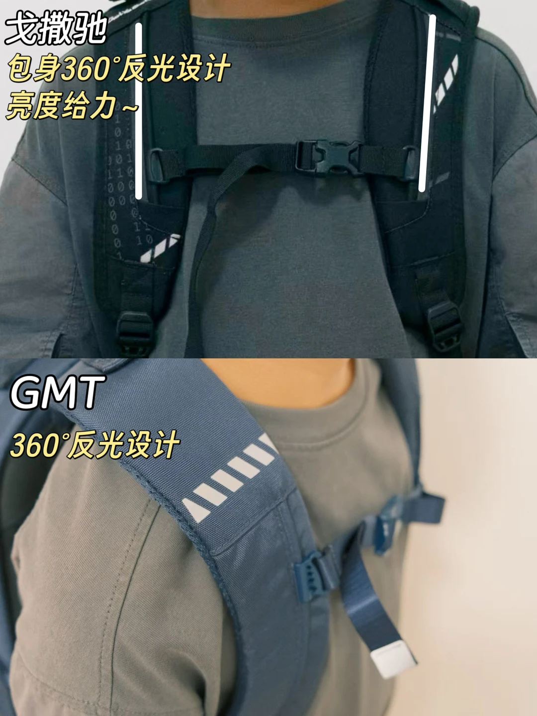 1️⃣反光条设计:两款都有,测试了一下,我觉得戈撒驰反光范围大,而且亮