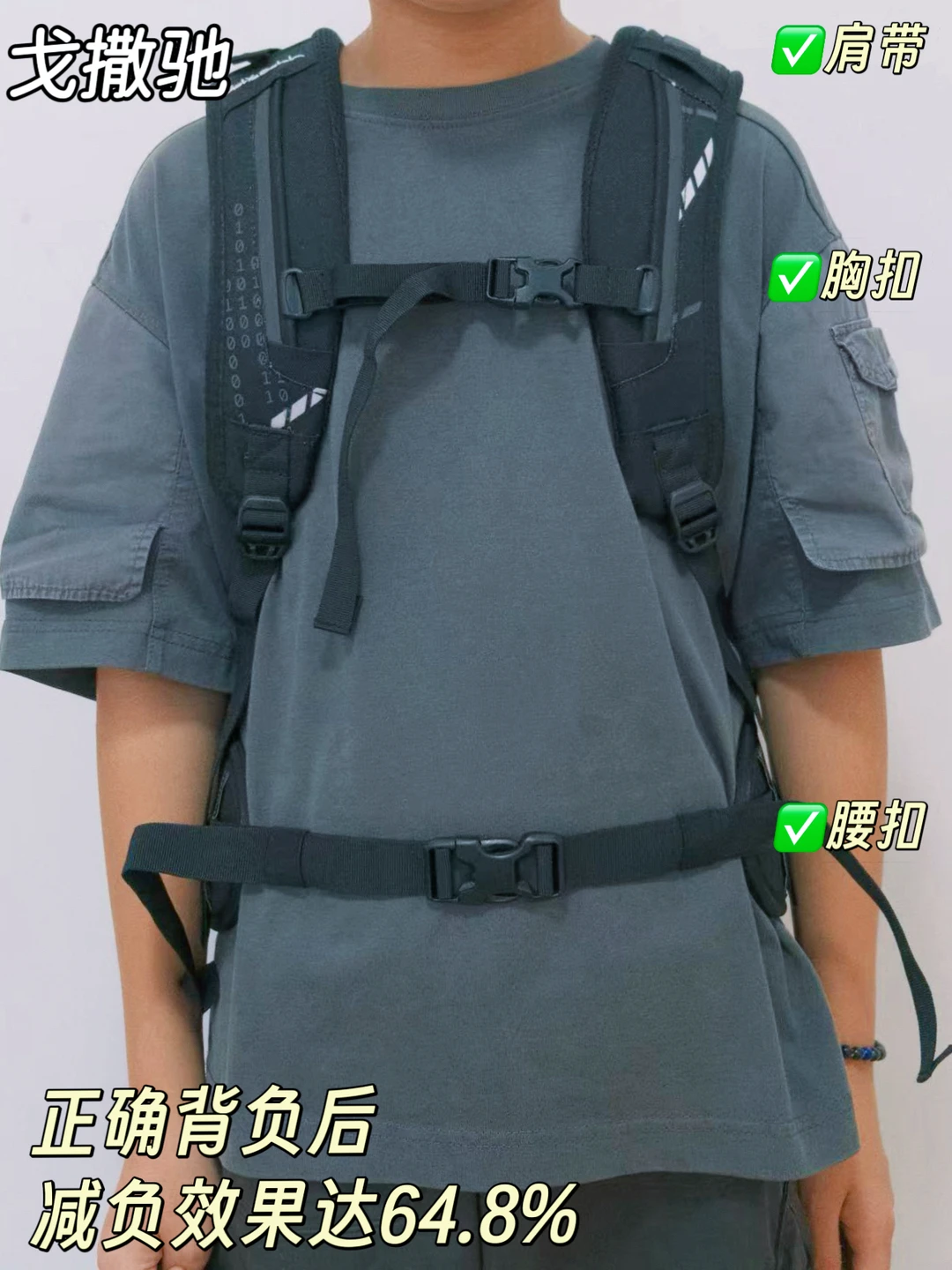 ➡️戈撒驰:内置U型铝制支撑杆,能更好地贴合背部曲线,吸收来自书包的撞击力,加上3D透气背板,支撑和舒服都占了,拉紧肩带、扣好胸、腰扣后,减负效果能达64.8%,小翼说:肩膀终于不难受了!