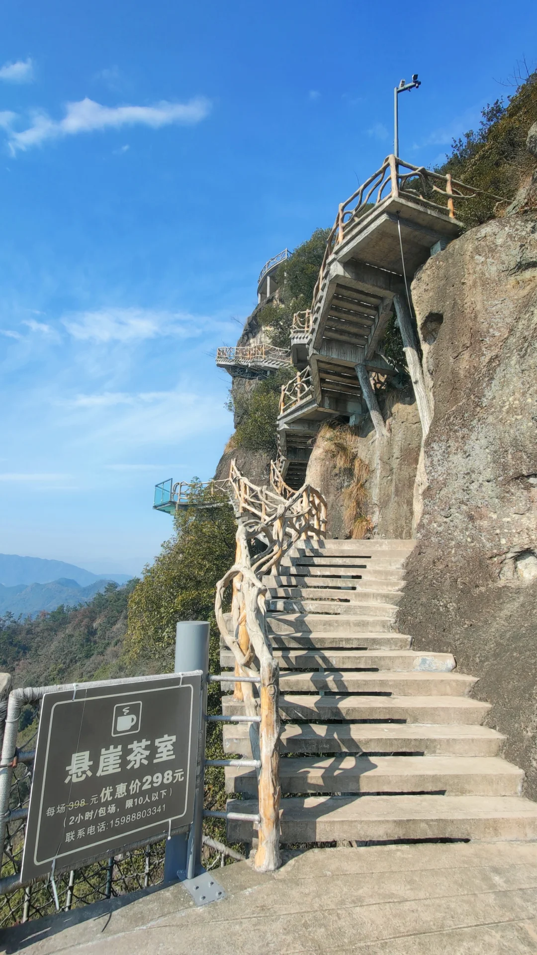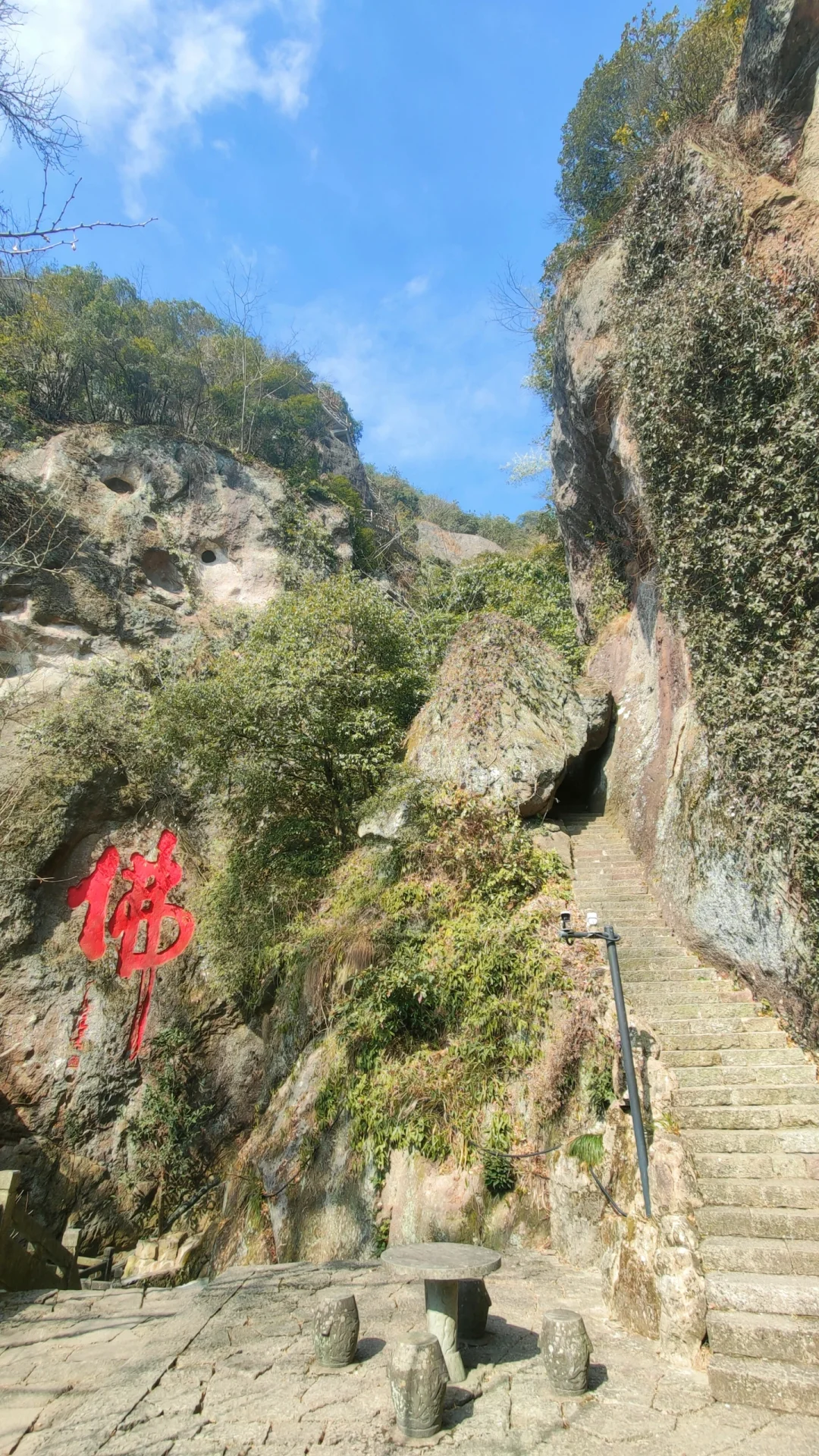 ⭐️索道上山,下来后会看到一整块矗立的褚红色山峰,两侧写着“神仙都会周泰汉,道德根源天地人”,横批是“风楼”,走进山门就是清音阁,凌空构架于悬崖峭壁之上,远近山川尽收眼底,观景绝佳,真的是“江南悬空寺,悬妙山水间”。