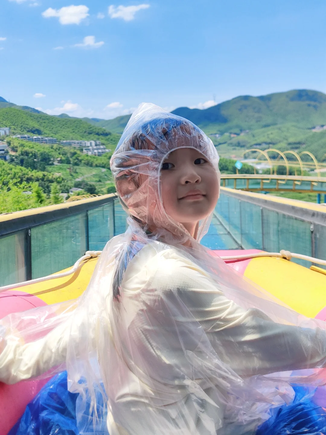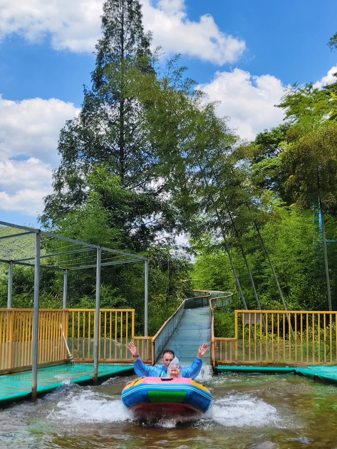 漂流全长1.2km,小丸子全程尖叫连连,万里晴空下,青山绿树间,穿越竹林山谷,一路乘风破浪,仿佛化身一个小勇士。