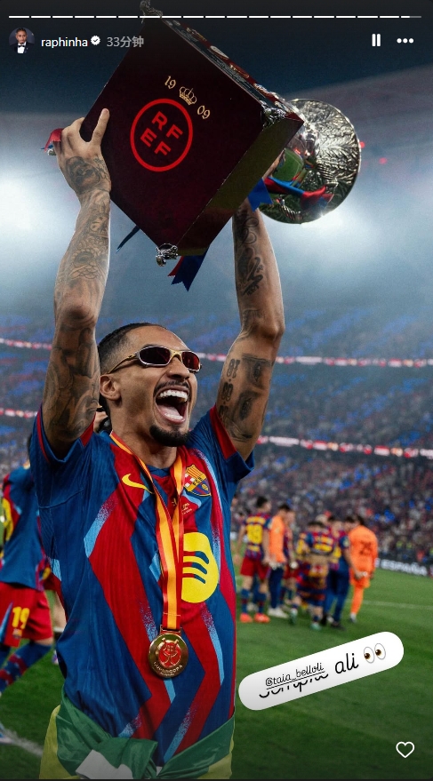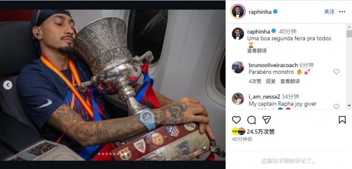 决赛对皇马独进两球!拉菲尼亚更新个人社媒:祝大家周一愉快