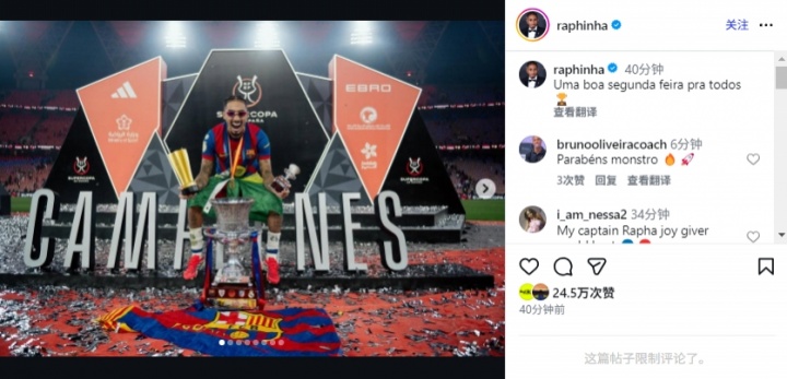 直播吧01月13日讯在独进两球率领巴萨3-2战胜皇马,夺得西超杯冠军后,拉菲尼亚在40分钟左右前更新了个人社媒,他晒出了自己与队友一起捧杯、庆祝夺冠的照片,并写道:“祝大家周一愉快”