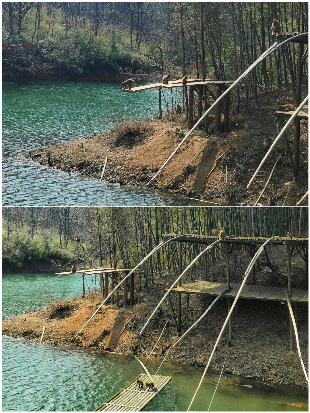 🐒往茅山问道方向走,看到彩虹桥就到了茅猴跳水的地方啦,敲多的茅猴,每只小茅猴跃跃欲试,争先恐后,有幸看到了小茅猴跳水,可爱的不得了。
