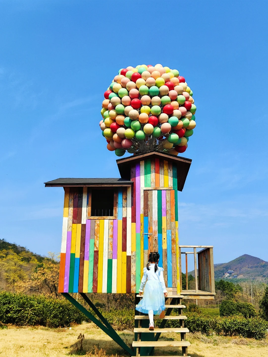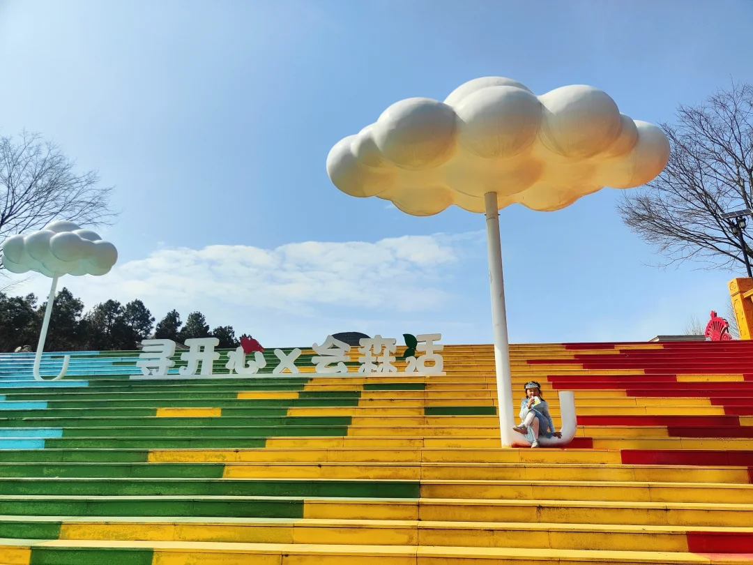 在魔法黑森林入口,彩虹台阶和白云伞配上蓝天白云,敲出片。