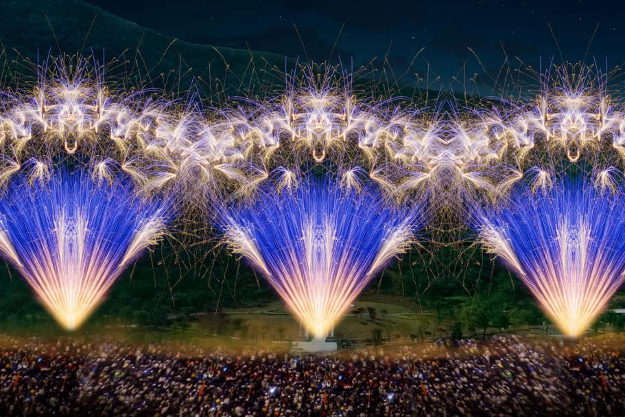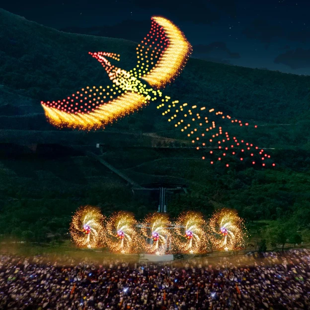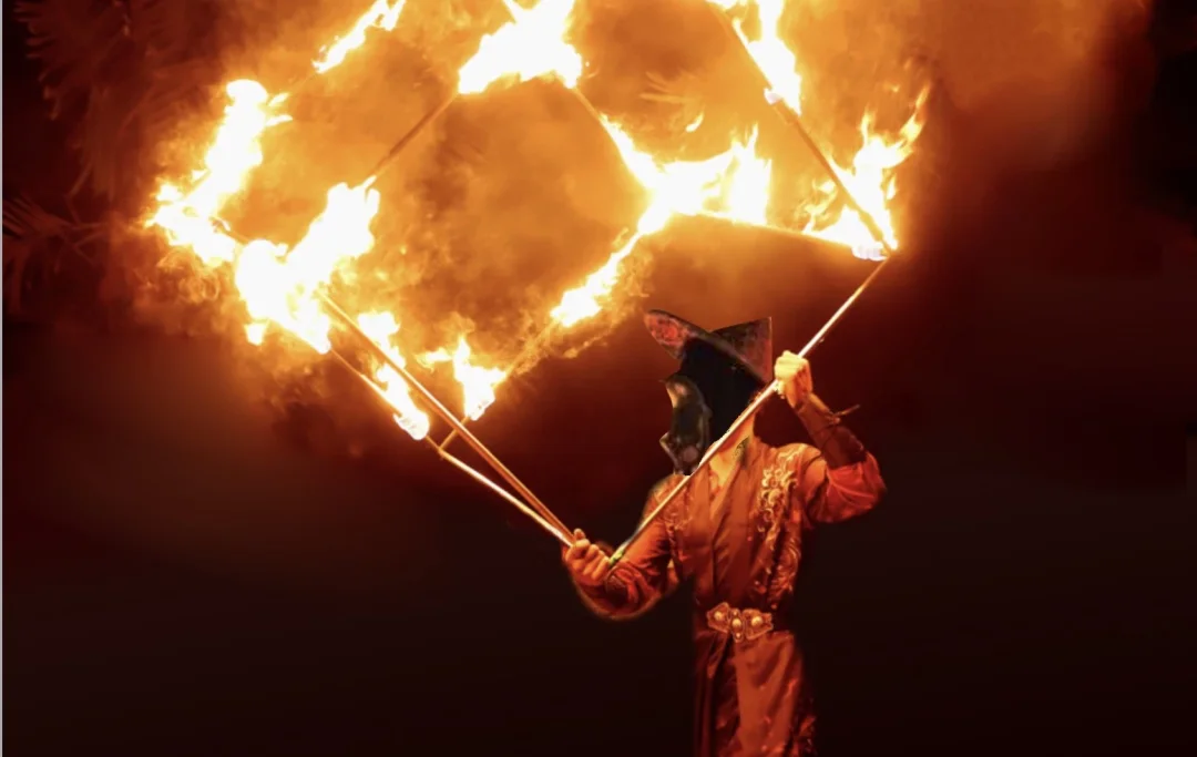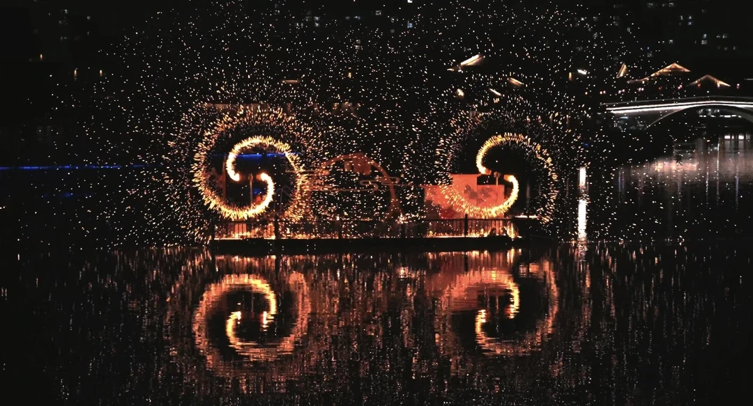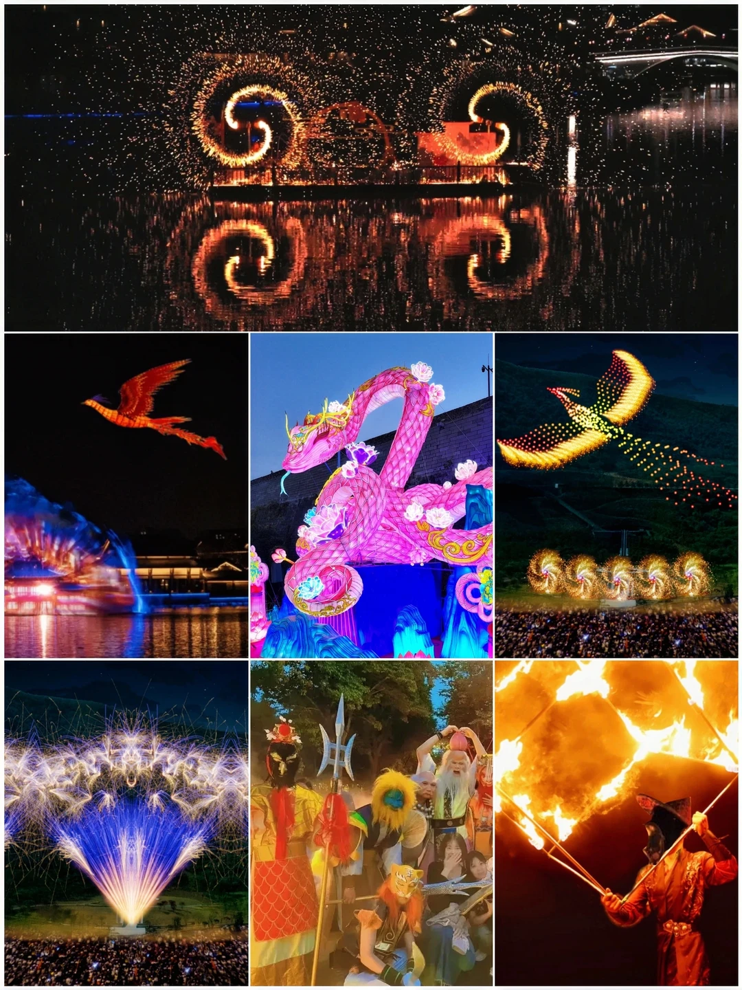 非遗打铁花、火魔方、胸口碎大石、晃板翘碗、蹬技、顶板凳等精彩杂技以及喷火变脸等。
