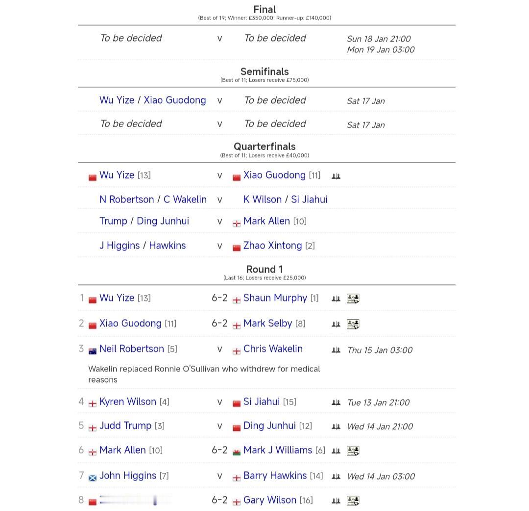 三战三胜的中国队,今晚9点斯佳辉登场,对阵“囧哥”凯伦·威尔逊。希望斯佳辉发挥实力,继续展现中国球员在本届大师赛赛场的统治力! 明天凌晨3点,约翰·希金斯对阵巴里·霍金斯。 加油!是否依旧能以6-2的比分结束这两场比赛?前四场都是6-2的比分!