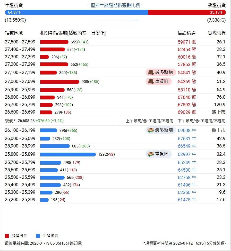 中信证券牛熊证街货分布图中的数据显示,熊证街货重货区在27,000-27,099区间,该区间最新熊证数量为908张,较上一交易日增加185张;熊证街货最多新增在27100-27199区间,该区间最新熊证数量为390张,较上一交易日增加186张。
