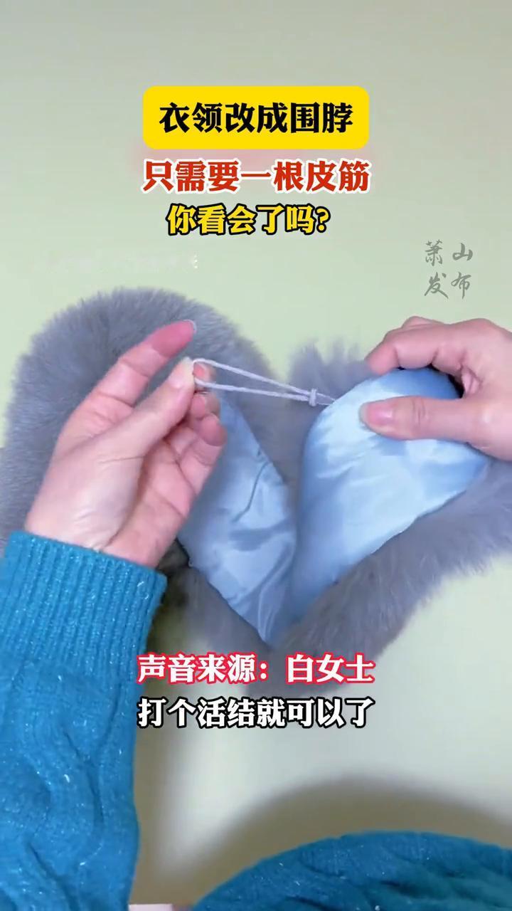 衣领改成围脖只需要一根皮筋,你看会了吗? 12月17日,湖南。声音来源:白女士。 这个是旧羽绒服上拆下来的毛领,丢了怪可惜的。 ·去找一个小的橡皮筋,毛领上本身会有扣眼瓣。 ·然后把橡皮筋穿过去,打个活结就可以了。 ·把另外一头从橡皮圈里面插过去,整理一下。 一个看上去毛茸茸,又很暖和有气质的围脖就做好了。