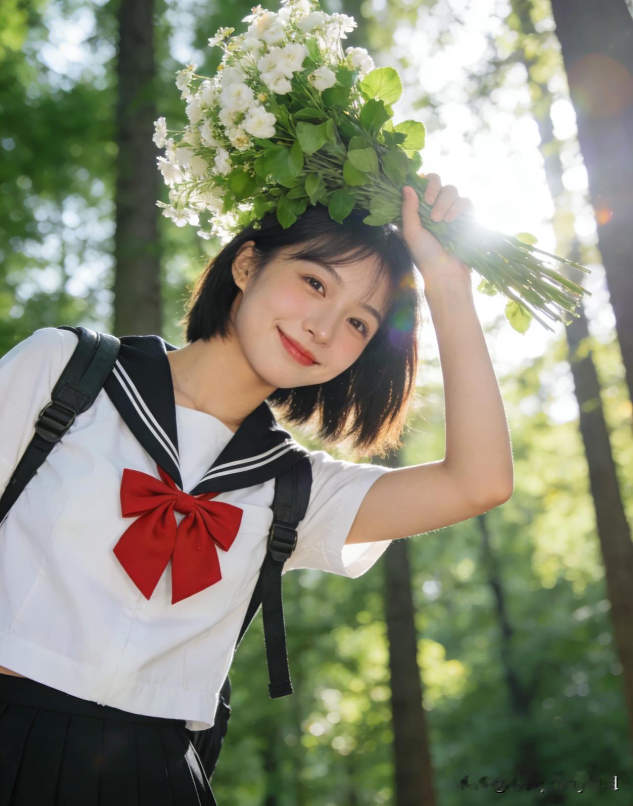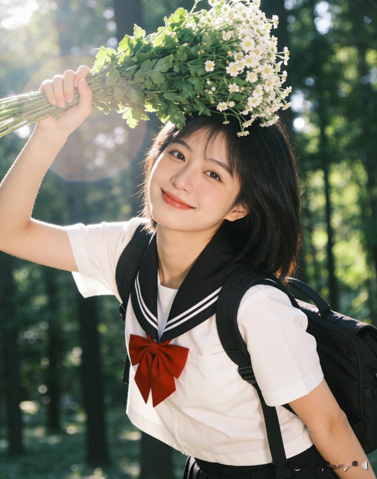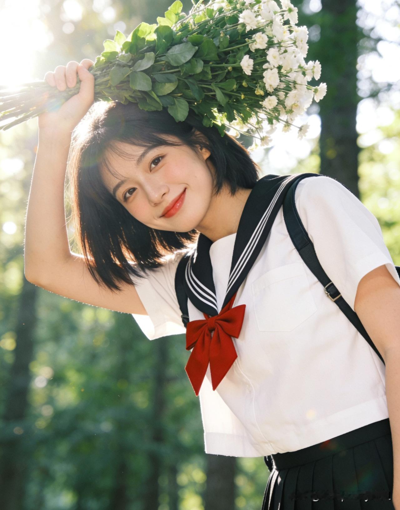 画面展现日系清新风格写真。主要人物身着经典日式水手服校服,白色上衣搭配黑色百褶裙,系红色领结,背着双肩背包。人物右手举着一大束绿叶白花置于头顶,侧身倾斜,头部微转面向镜头,嘴角上扬,露出甜美自然的微笑,表情灵动活泼。 妆容清新淡雅,突出自然好气色。花束为画面增添自然浪漫氛围。光影柔和,阳光透过树林形成斑驳光晕,营造出温暖惬意的氛围,无明显滤镜效果。画面元素以人物、花束、树林为主,色彩清新明亮,绿色的树林、白色的上衣、红色的领结相互映衬。