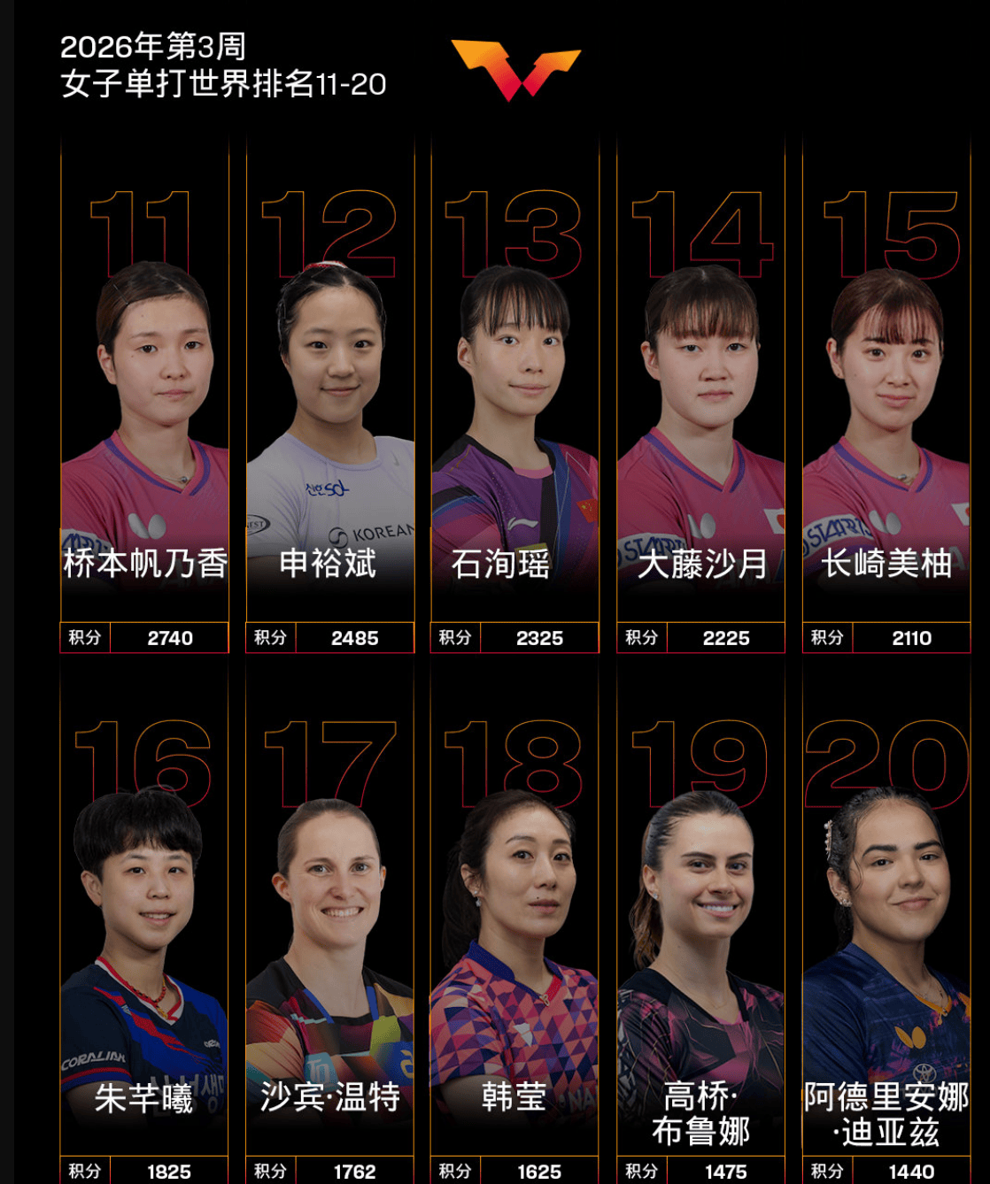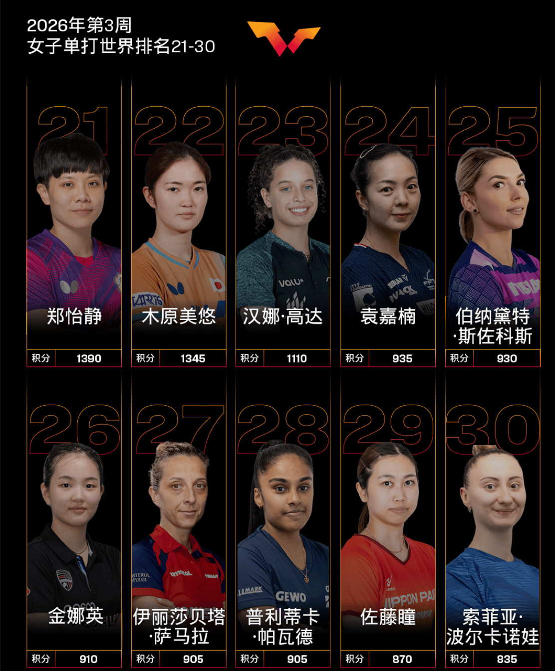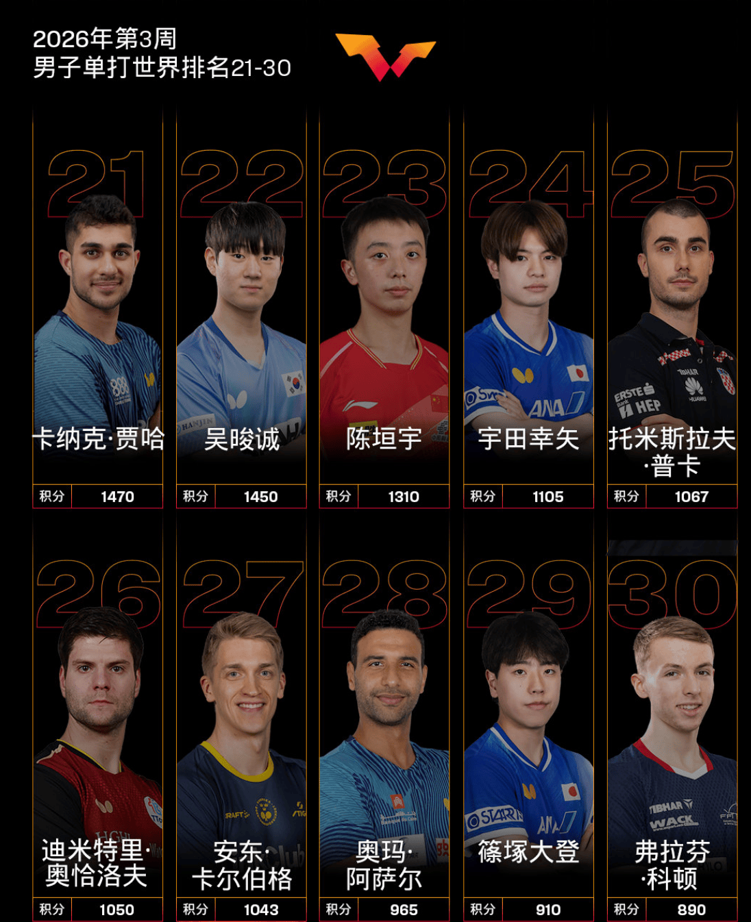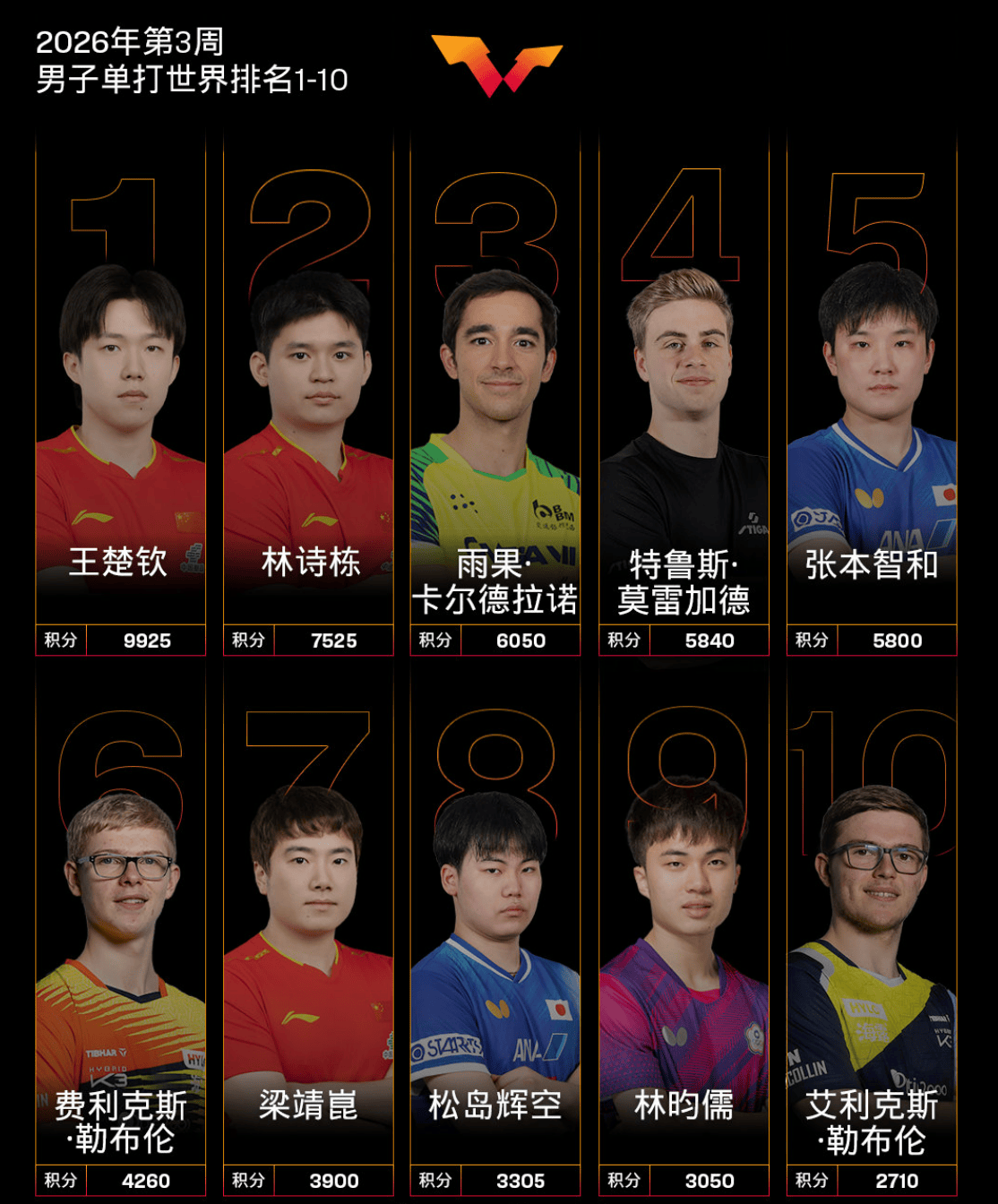 虎扑01月13日讯国际乒联发布2026年第3周世界排名,具体如下: