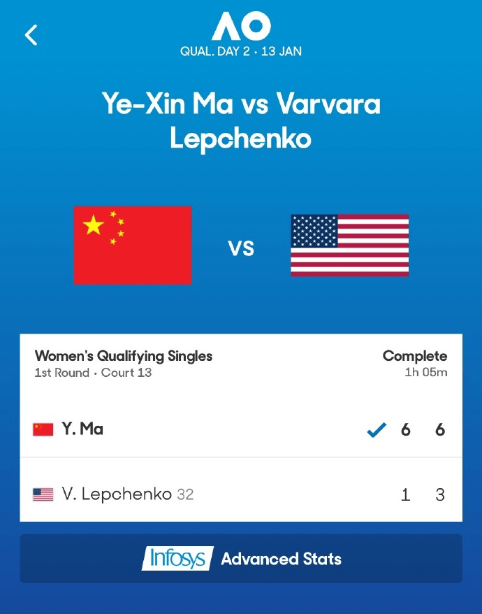 澳网资格赛:马烨欣2-0勒普琴科,将战韦思佳和凯莉耶娃胜者