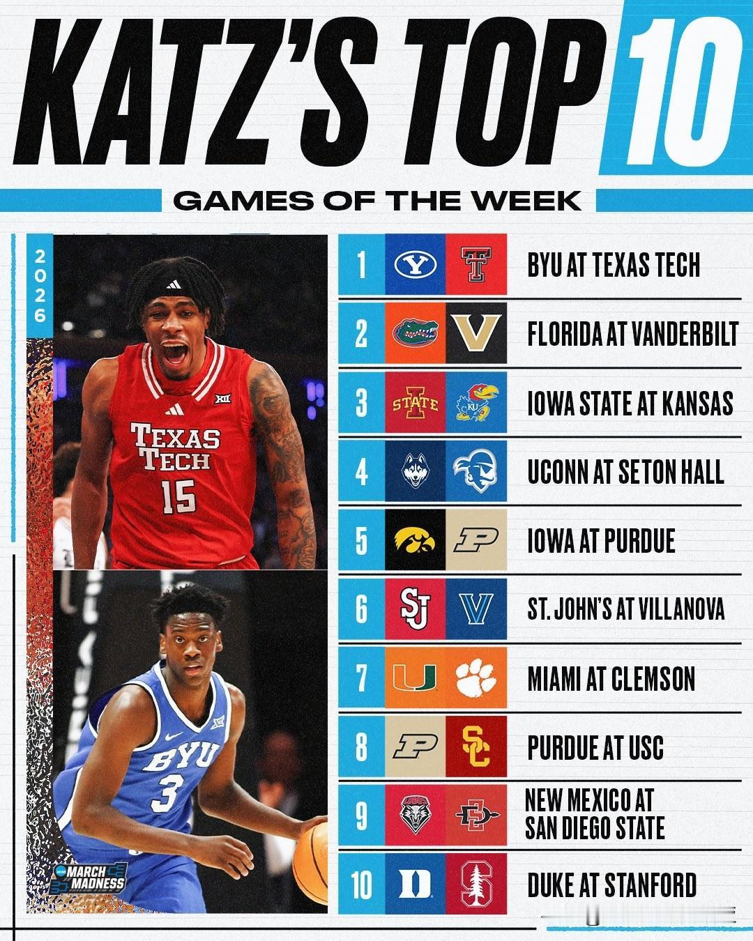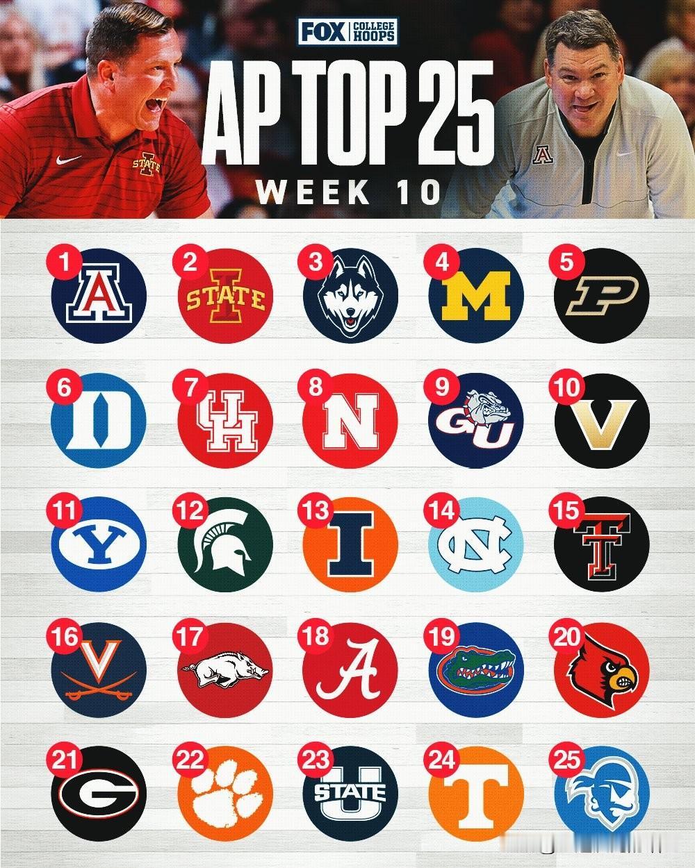 美联社公布第十周前25强榜单,亚利桑那大学稳居第一,爱荷华州立与康涅狄格大学紧随其后,官网评选的上周最佳球队是击败密歇根的威斯康辛大学,最佳球员是范德堡控卫Tyler Tanner,2026年nba选秀 最佳新人是休斯顿控卫Kingston Flemings。