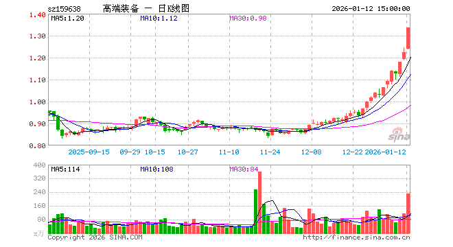 1月12日,高端装备ETF(159638)涨9.07%,成交额2.97亿元。当日份额增加1.17亿份,最新份额为22.18亿份,近20个交易日份额增加2.96亿份。最新资产净值计算值为28.87亿元。