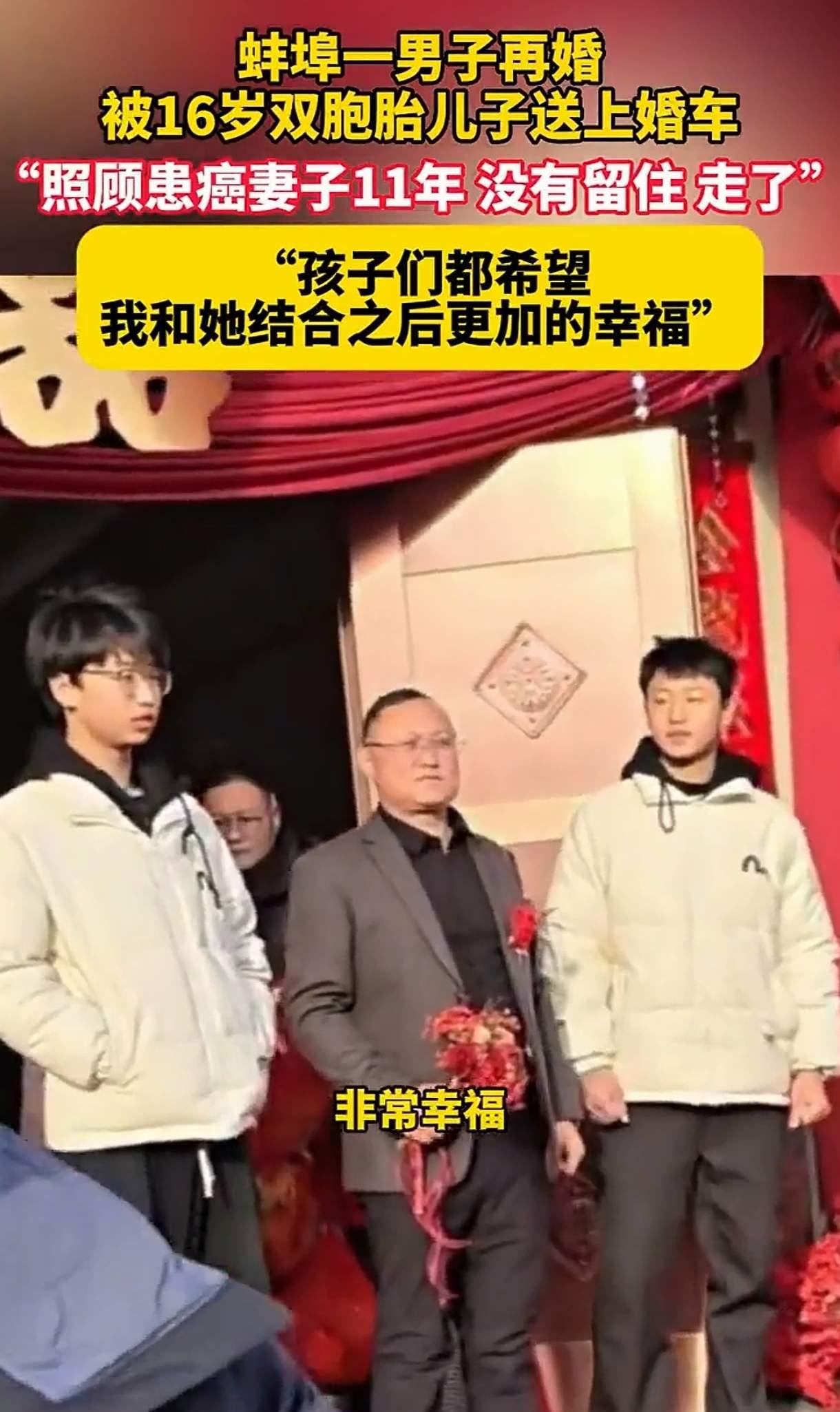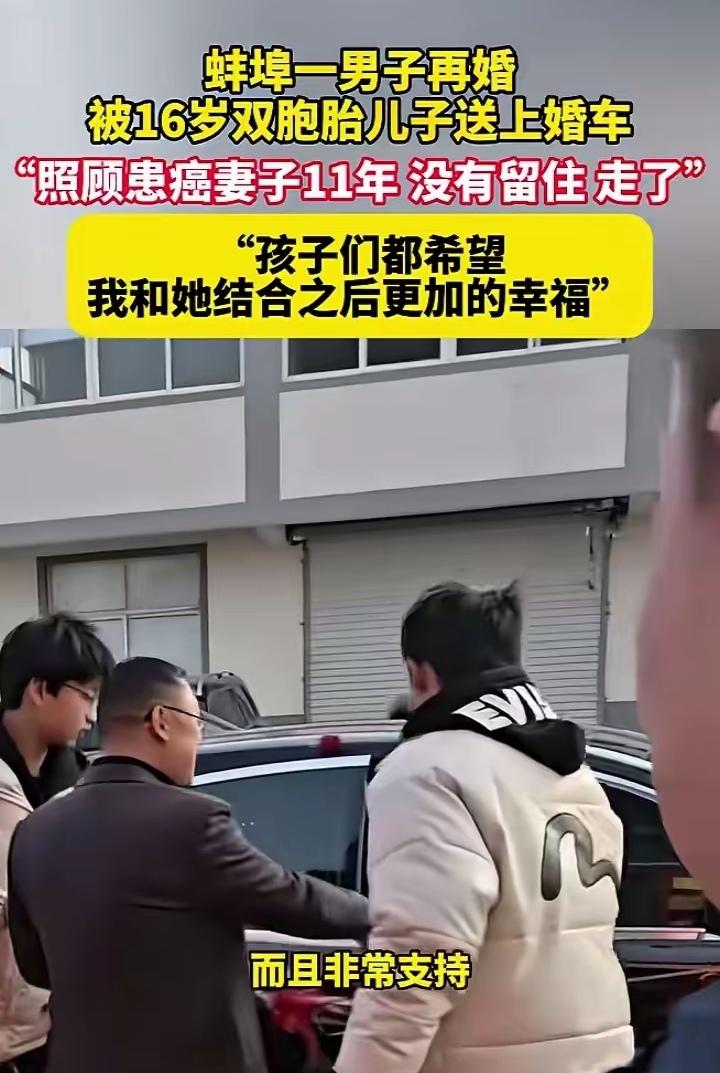 1月12日安徽蚌埠,一位爸爸再婚,身旁16岁的双胞胎儿子并肩站着,亲手把他送上婚车,没有不舍拉扯,只有满眼祝福,这画面真的很感人。 这位爸爸说,前妻11年前查出癌症,他贴身照顾了整整11年,拼尽全力还是没能留住她,之后一个人又当爹又当妈,把双胞胎拉扯到16岁。如今再婚,孩子们打心底支持,还盼着爸爸和新妈妈往后能更幸福。 说实话,现在多少重组家庭鸡飞狗跳,孩子抵触、大人为难,可这家人却把日子过成了榜样。11年不离不弃照顾重病妻子,是责任也是深情;一个人扛下生活重担养大孩子,是担当也是父爱;而两个16岁少年懂得体谅父亲不易,用祝福成全爸爸的幸福,是懂事更是通透。 很多人说二婚难,尤其带孩子的二婚更难,可难的从来不是二婚本身,是有没有真心换真心。这位爸爸用行动给了孩子安全感,新妈妈想必也用温柔暖了孩子的心,才让孩子们愿意敞开心扉接纳,愿意笑着送爸爸开启新人生。 这世上最珍贵的从来不是轰轰烈烈的爱情,而是不管经历多少风雨,依然有人守着责任,有人懂得感恩,有人愿意给彼此一个温暖的家。 愿这位爸爸往后三餐四季皆安稳,和新妻子互敬互爱,双胞胎兄弟健康长大,一家人往后幸福美满,再也没有遗憾!