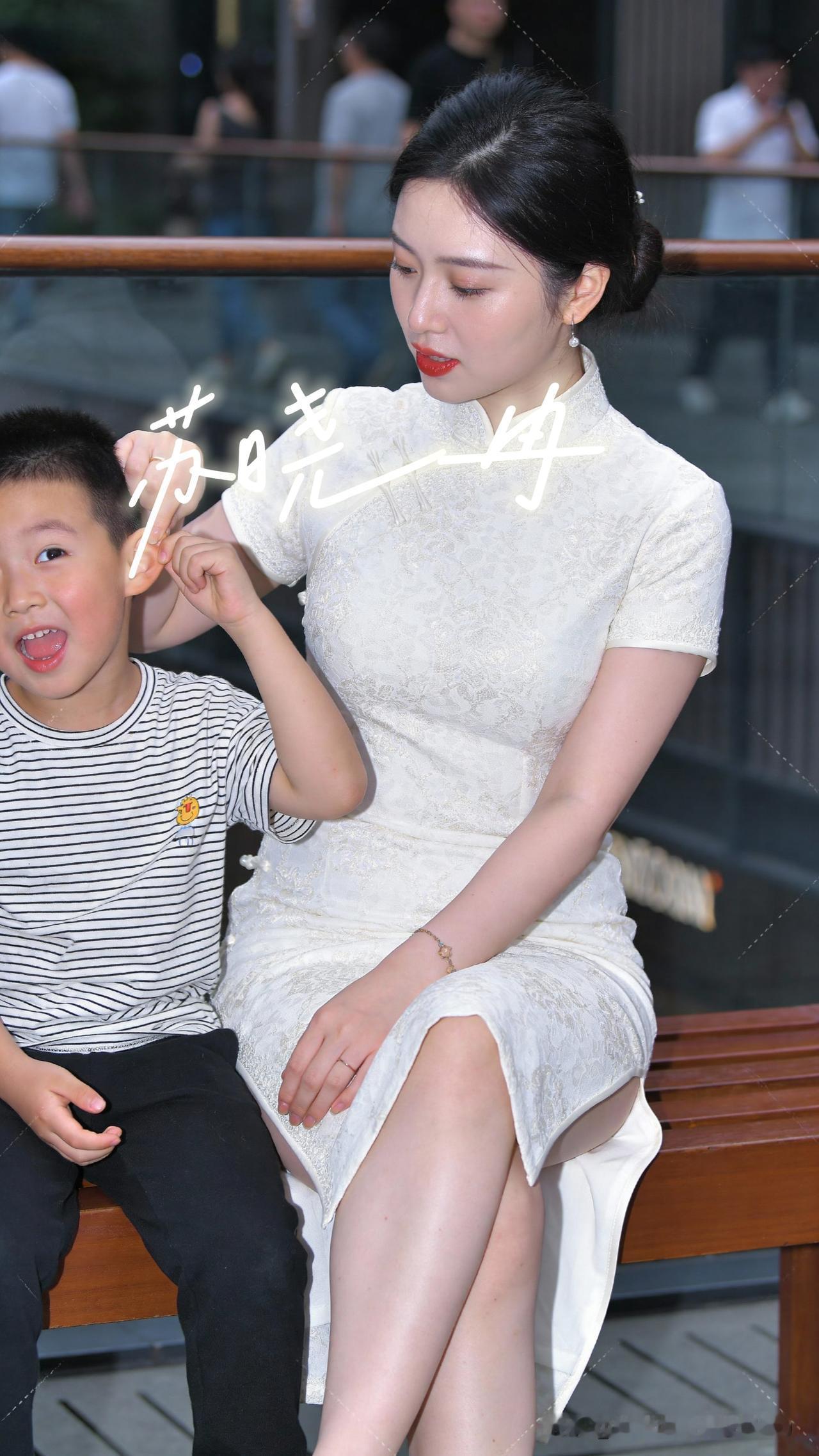 母子趣味互动,轻捏耳朵尽显亲子温情 城市商圈的休闲区域里,一位穿着素雅白色旗袍的