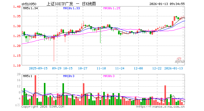 1月13日,上证50ETF广发(510950)开盘涨0.00%,报1.341元。上证50ETF广发(510950)重仓股方面,贵州茅台开盘涨0.25%,中国平安涨0.37%,招商银行涨0.19%,紫金矿业涨0.38%,长江电力涨0.18%,兴业银行涨0.10%,恒瑞医药涨0.70%,中信证券涨0.24%,寒武纪跌1.65%,中芯国际跌0.13%。