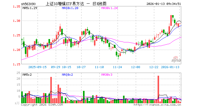 1月13日,上证50增强ETF易方达(563090)开盘跌0.08%,报1.289元。上证50增强ETF易方达(563090)重仓股方面,贵州茅台开盘涨0.25%,中国平安涨0.37%,药明康德涨3.16%,海尔智家涨0.23%,深南电路跌1.11%,澜起科技涨0.00%,沪电股份涨1.77%,紫金矿业涨0.38%,豪威集团涨0.19%,国泰海通涨0.62%。