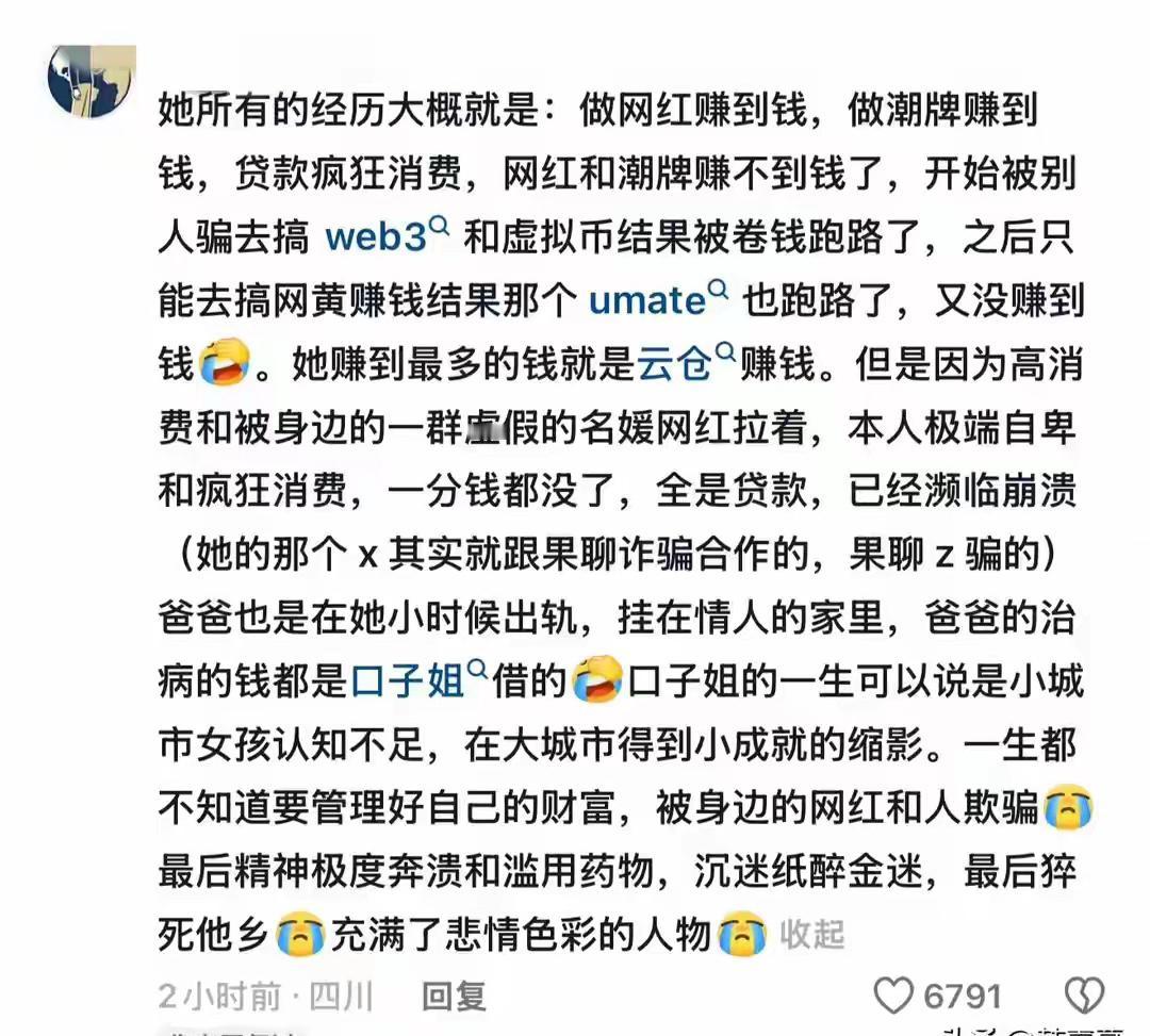 网红口子姐死因真相曝光,糜烂生活毁三观,1月1日熬夜猝死,背后道尽了一个百万网红人设的残酷真相。四川遂宁人,大学毕业做炒鞋赚到第一桶金,借助短视频放大,成为穿搭网红,尽显精致人生,生活圈子扩大,看到更多灯红酒绿,沉醉纸醉金迷无法自拔,消费跟不上赚钱能力。开始搞快钱,做虚拟币,进入不懂的赛道被人割韭菜。去到国外转换人生,各种暴露的图片、视频,陷入黄赌,自曝得了梅毒,国外混不下去,又回到国内,一屁股债,被债主追着要,心理压力很大。做网红,看着光鲜,接触的人光怪陆离,来钱太快的时候太容易迷失自我,最后沉沦下去无法自拔,万劫不复。网红口子姐