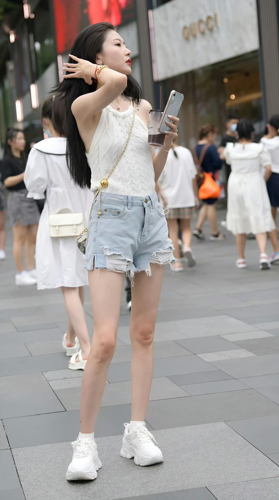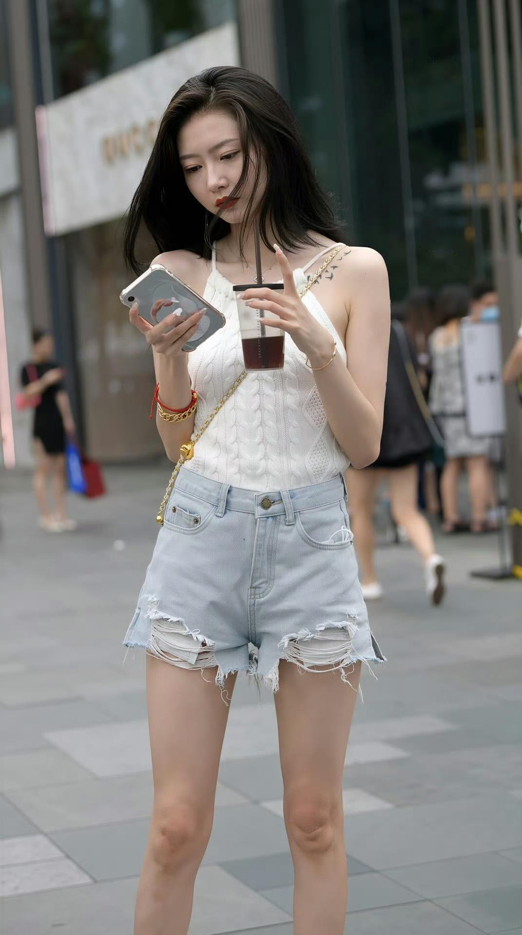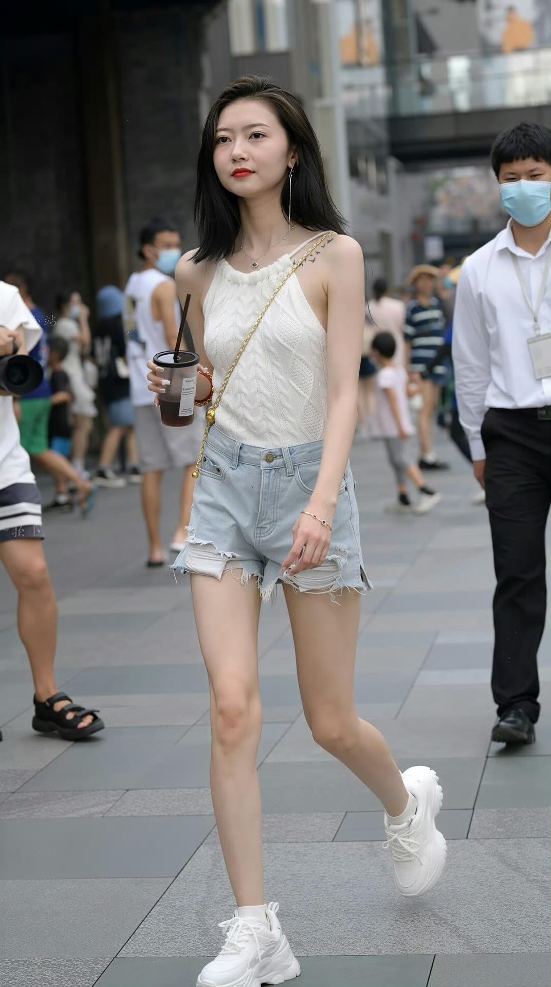 白色针织吊带配浅蓝破洞牛仔短裤,小白鞋加持,街头风简约又显腿长~