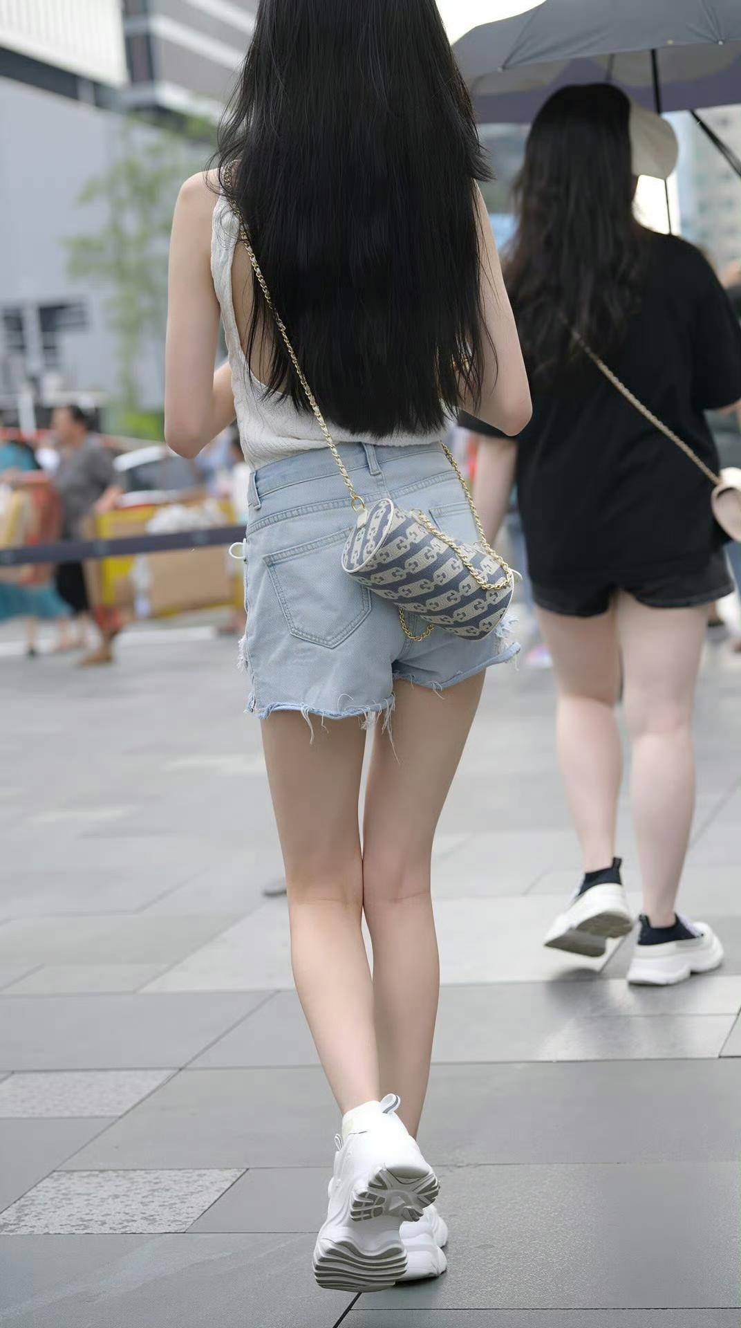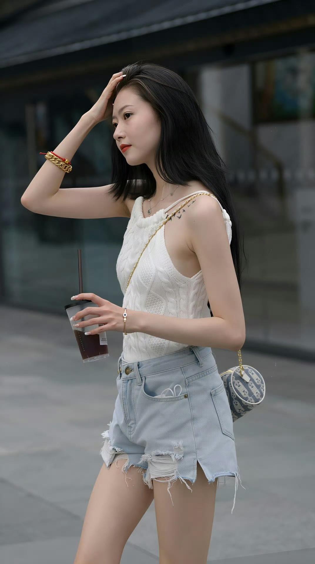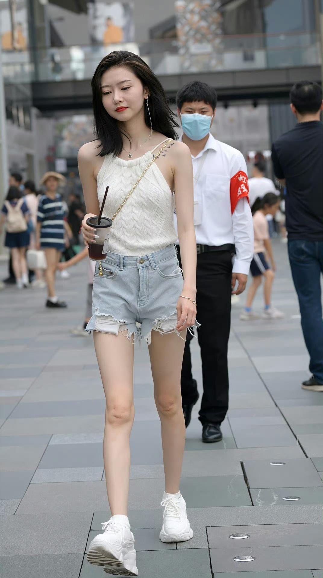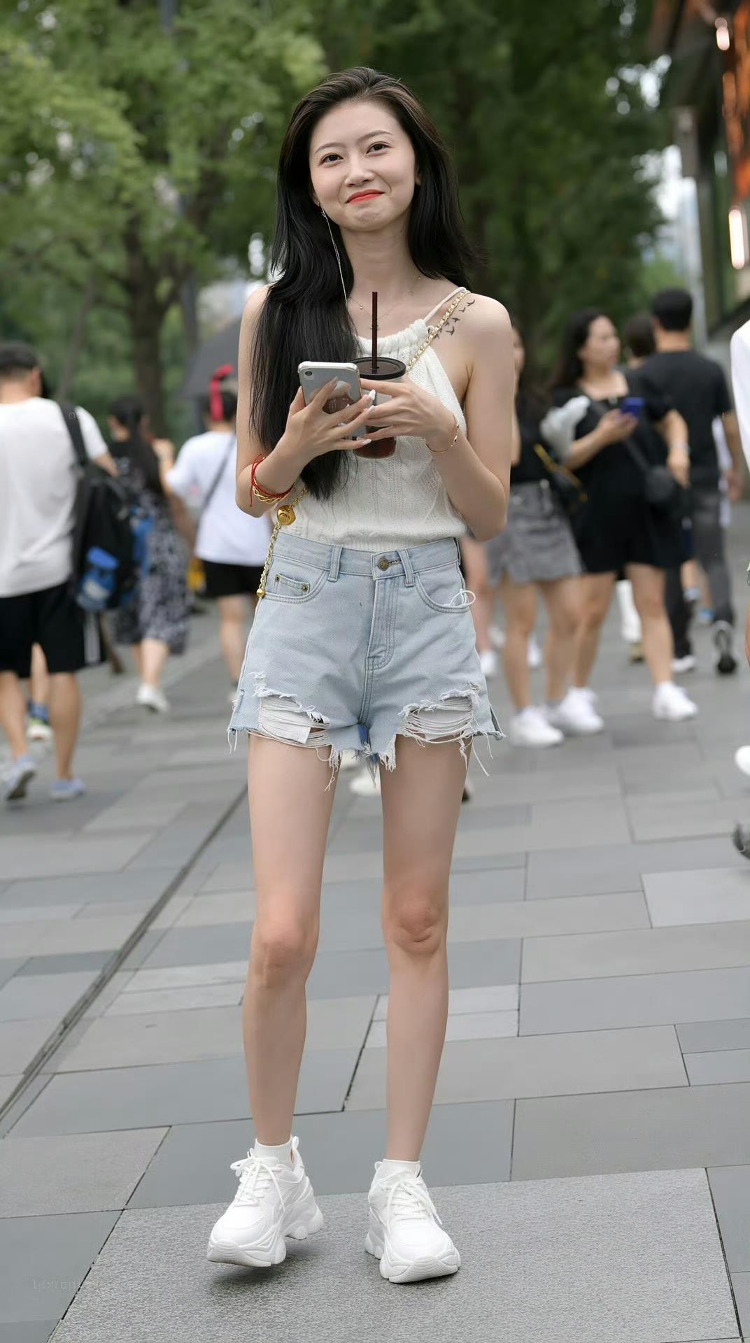 白色针织吊带配浅蓝破洞牛仔短裤,小白鞋加持,街头风简约又显腿长~