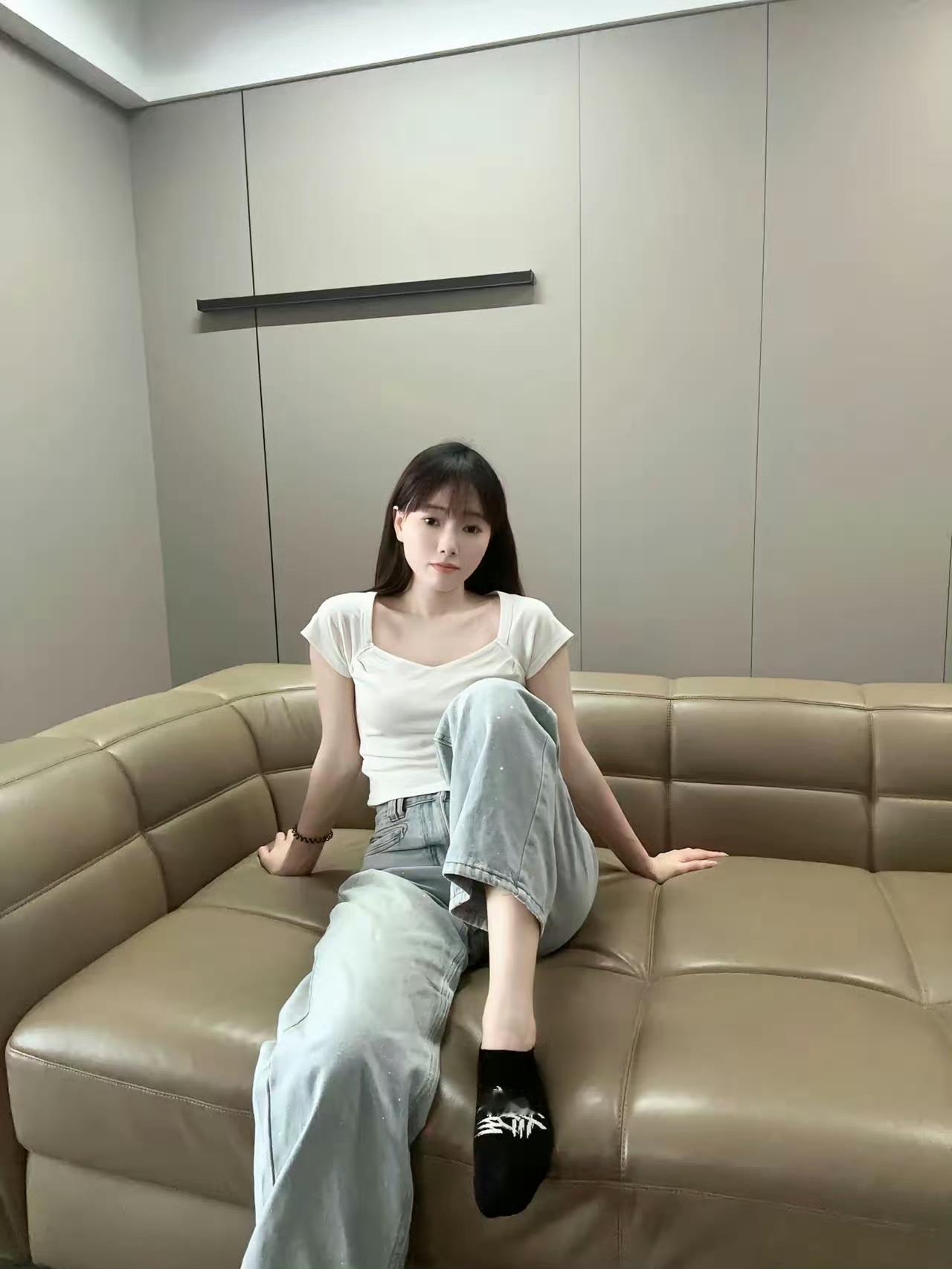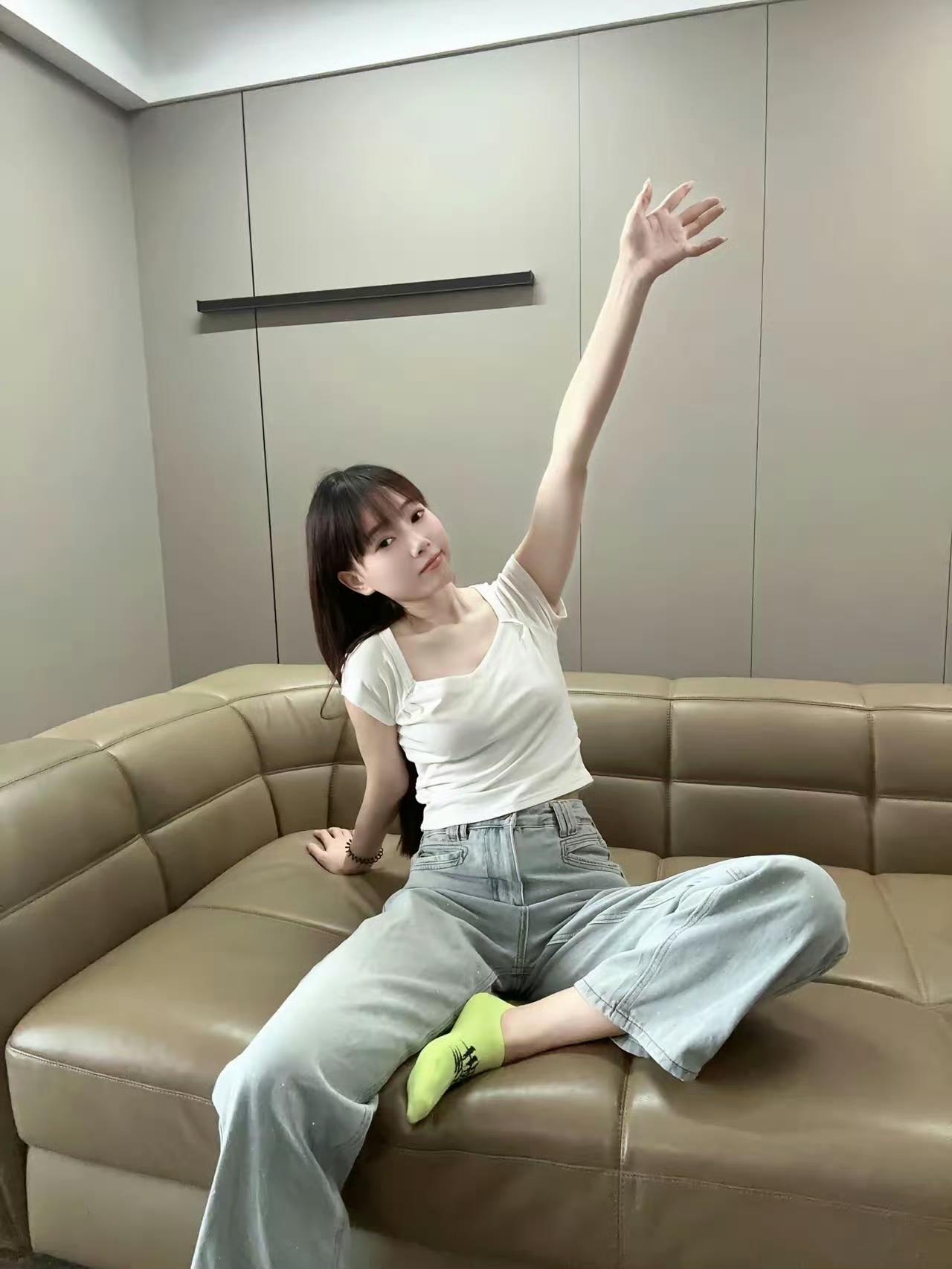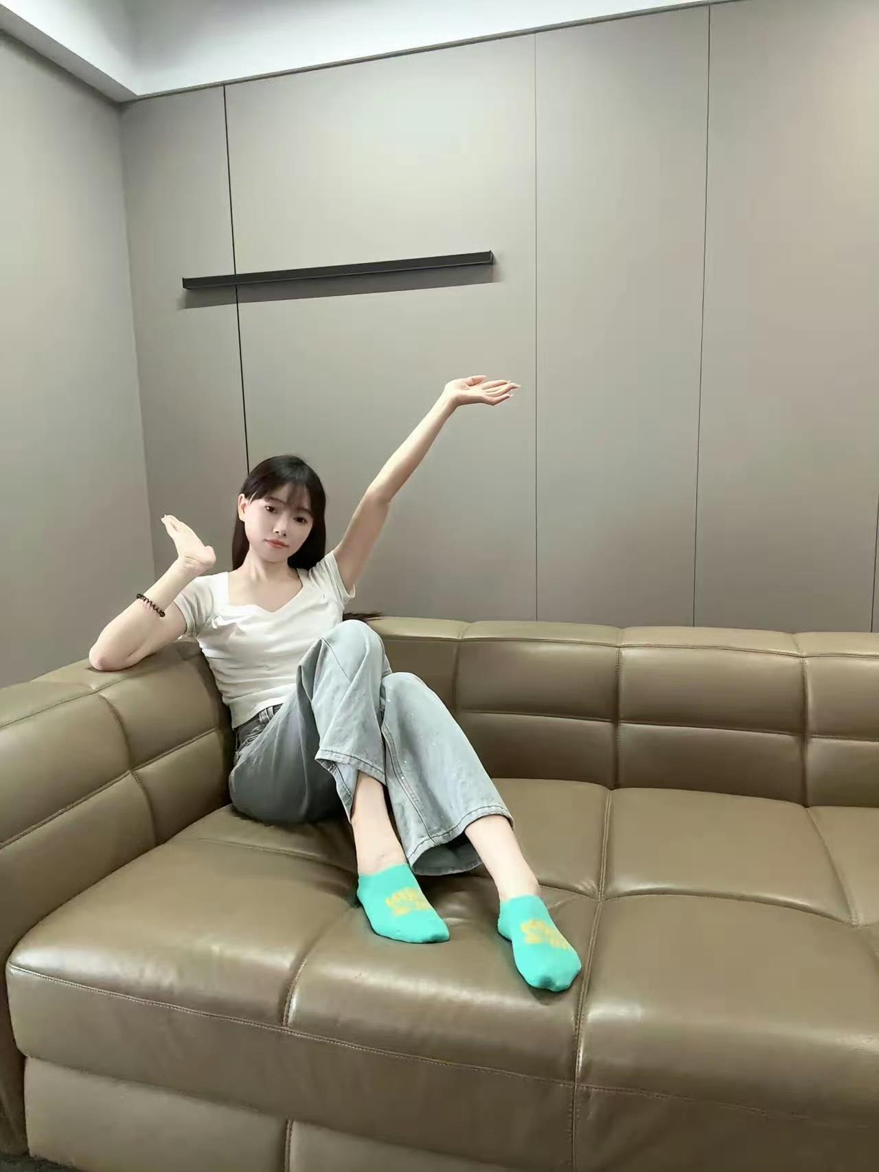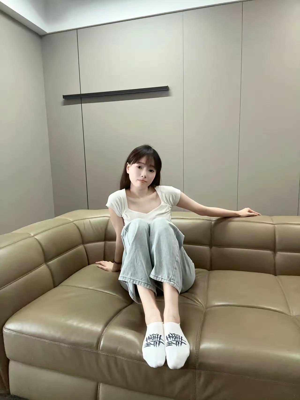 白T配浅蓝阔腿牛仔裤,是永远不会出错的简约公式,而彩色袜子就像居家穿搭里的小彩蛋,黑、蓝、绿、橙的撞色切换,让基础款也能穿出灵动的随性范儿,沙发上的随意摆拍,都是藏在日常里的松弛美好。