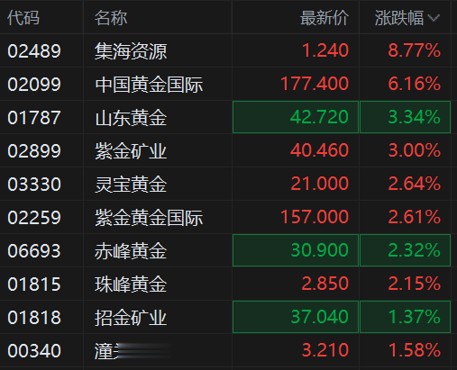 金价新高,带动港股黄金股继续上涨,其中,中国黄金国际涨超6%,山东黄金涨3.3%,紫金矿业涨3%,灵宝黄金、紫金黄金国际涨2.6%,赤峰黄金、珠峰黄金涨超2%,招金矿业、潼关黄金涨超1%。此外,招金矿业、紫金矿业、中国黄金国际均创历史新高。