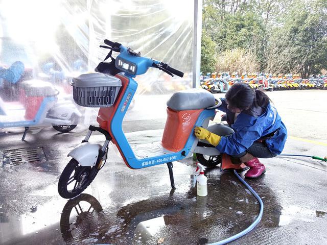 完成维修保养的车辆送至清洗区,经高压冲洗、人工精洗、晾干后,进行打蜡、更换坐垫套、加装冬季防风防寒手把套等外观维护,最后按车辆洁净度、头盔及刹车完好性等4项标准核验,达标后方可出仓,重新投放至城市街头。整个流程环环相扣,让共享电单车保持“安全在线、颜值在线”。
