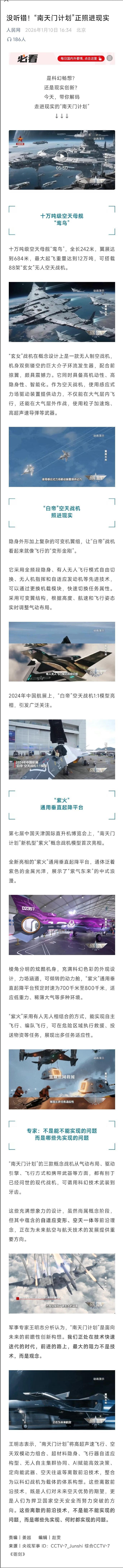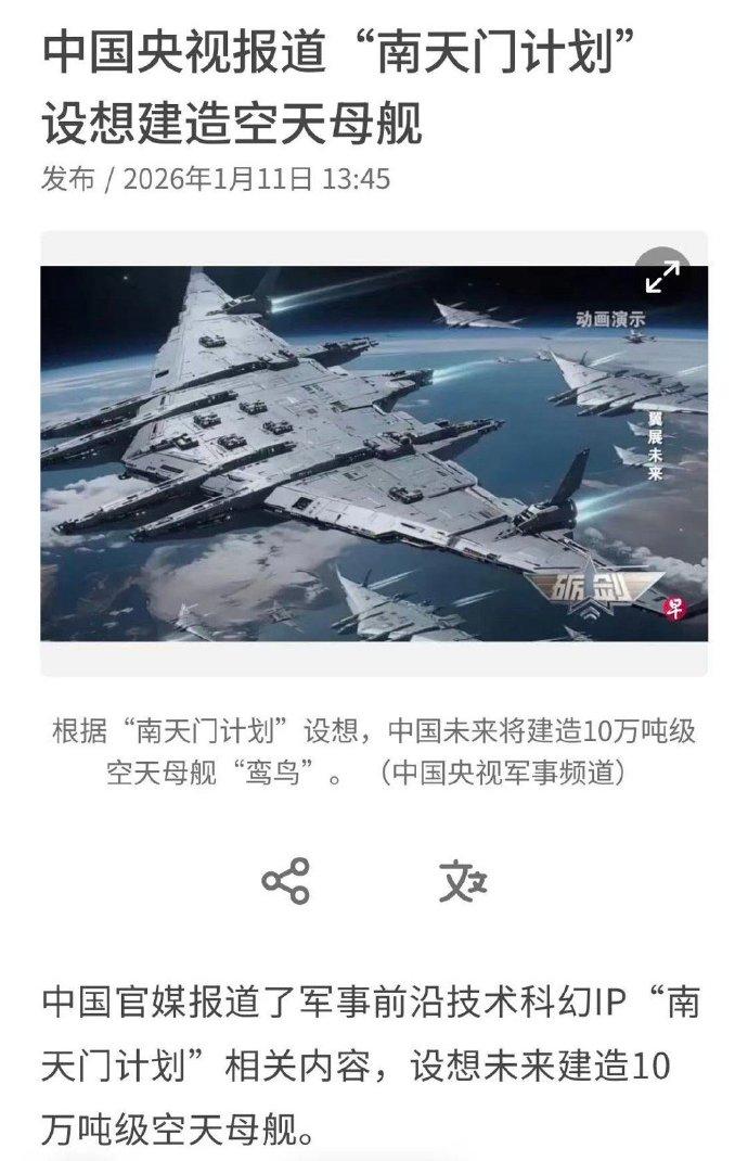 南天门计划居然是真的?咱妈真在月球烫外星人屁股了?美国跟不跟? 1月9号央视专题报道了南天门计划“正照进现实”, 这几年听到的白帝空天战机、玄女、紫火、还有战术机甲居然都不是纸上谈兵。 这才是真正的“星球大战”,咱就说美国要不要跟进? 作为南天门计划的体系核心,“鸾鸟” 空天载机平台堪称 “空中巨无霸”,定位是跨大气层的战略指挥与攻防中枢。它长度242米,翼展宽至684米,最大起飞重量12万吨,堪比一座漂浮在空天的移动基地。动力方面搭载了两组大型核聚变反应堆和38台复合引擎,能支撑其在近地轨道长期驻留,还能灵活完成跨大气层机动。武器配置也极具威慑力,包括 4 台高功率粒子扩散炮、16 台脉冲机关炮以及 42 组导弹垂发单元,更能搭载 88 架 “玄女” 无人战机,形成强大的作战集群。 “白帝” 采用有人 / 无人双模式设计,机身长度 24.6 米,翼展 14.1 米,空重 23.9 吨,最大起飞重量 51.9 吨,大气层内最大能达到4.8马赫,大气层外则能实现第二宇宙速度,轻松穿梭于天地之间。配备了吊舱式脉冲粒子加速炮、2 门小型激光速射炮,还能携带6枚中远程超高速导弹和 4 枚近程导弹,再加上全频段隐身能力和可变机翼设计,既能独立作战,也能指挥无人机群协同行动。 “玄女” 无人空天战机专门负责制空与精确打击任务。它尺寸和 “白帝” 相近,标准任务重量 47.2 吨,动力系统采用变循环引擎加感应式力场驱动,速度性能与 “白帝” 持平,大气层内最大 4.8 马赫,大气层外可达第二宇宙速度。凭借高机动、高隐身的优势,再搭配脉冲粒子加速炮和高超声速导弹,它能在大气层内外灵活作战,尤其擅长蜂群战术,多架协同可形成无死角的作战网络。 “紫火” 通用垂直起降平台是计划中的多用途支援担当,主打灵活适配各类场景。它的最大起飞重量 8 吨,有效载荷 2 吨,依靠力场涵道和可倾转动力舱提供动力,时速能达到 700-800 千米。这款平台的亮点在于适应性极强,能应对低重力、稀薄大气等复杂环境,还能在有人与无人模式之间切换,既可以搭载轻型武器执行作战支援任务,也能换装救援模块投入民生救援,是典型的军民两用构想。 最后是 “承影” 战术机甲,定位是低空与地面突击支援装备。它的高度为 5.2 米,时速可达280 千米,搭载 AI 协同动力系统,能实现步行与低空飞行双模式切换。武器配置包括激光速射炮和脉冲粒子炮,凭借灵活的部署能力和精准的打击效果,可与空中战机形成协同,在复杂地形中完成清障、突击等任务。 这些装备的设定虽充满科幻色彩,但每一项性能都紧扣当下的前沿技术方向,比如核聚变动力、高超声速飞行、隐身材料等。 南天门计划居然是真的 【南天门计划】多款可选空天战机合金模型玩具 送男孩的礼物