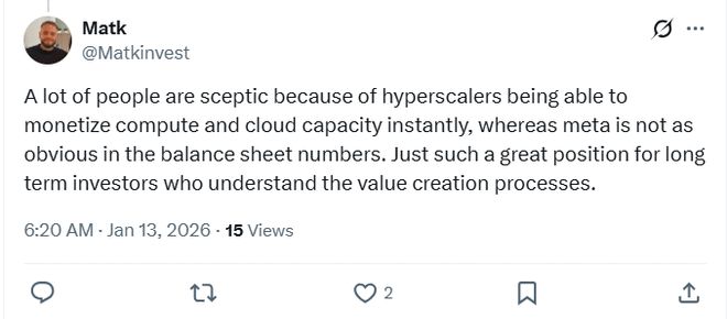 但也有人看到了硬币的另一面。网红投资客@Matkinvest在X上发文称:“许多人怀疑,是因为Meta的资产负债表不像云服务商那样能即时变现。但这恰恰为理解价值创造过程的长期投资者,提供了绝佳的上车位置。”