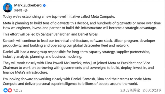 就在本周一,扎克伯格通过旗下社交平台Facebook发布了一条重磅消息:Meta正式启动名为“MetaCompute”的顶级倡议(Top-levelinitiative)。