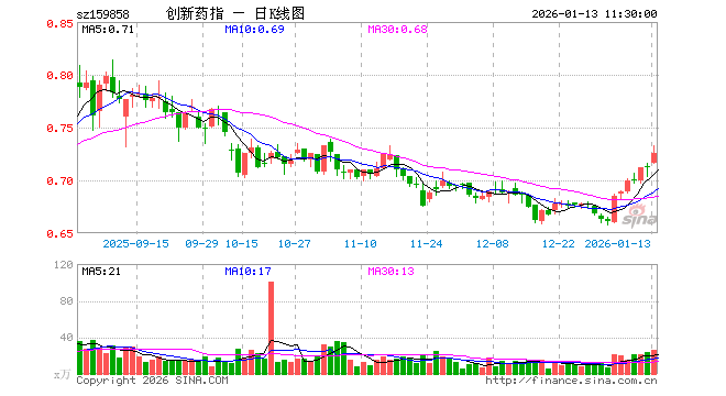1月13日,截止午间收盘,创新药ETF南方(159858)涨1.97%,报0.726元,成交额1858.96万元。创新药ETF南方(159858)重仓股方面,药明康德截止午盘涨5.76%,恒瑞医药涨2.19%,长春高新涨0.96%,科伦药业涨0.06%,复星医药涨2.15%,华东医药涨1.95%,百济神州跌0.20%,信立泰涨3.21%,康龙化成涨5.55%,百利天恒涨1.99%。