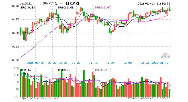 1月13日,截止午间收盘,创业大盘ETF(159814)跌0.87%,报0.682元,成交额2682.79万元。创业大盘ETF(159814)重仓股方面,宁德时代截止午盘涨0.24%,中际旭创跌0.68%,东方财富跌0.84%,新易盛跌1.91%,阳光电源跌1.76%,胜宏科技跌1.65%,汇川技术跌2.12%,迈瑞医疗涨0.81%,亿纬锂能跌0.53%,天孚通信跌5.96%。