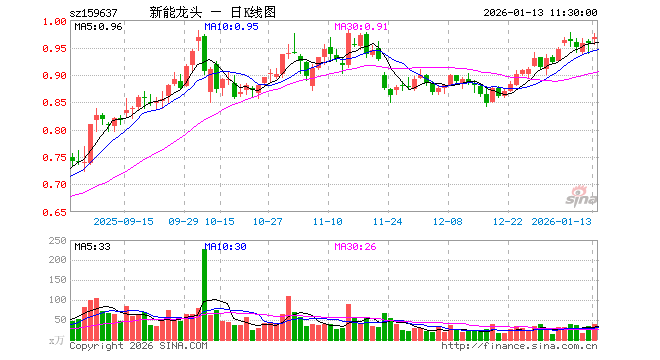 1月13日,截止午间收盘,新能源车ETF东财(159637)涨1.04%,报0.968元,成交额3850.89万元。新能源车ETF东财(159637)重仓股方面,宁德时代截止午盘涨0.24%,汇川技术跌2.12%,比亚迪涨0.86%,亿纬锂能跌0.53%,三花智控涨2.23%,华友钴业涨2.11%,赣锋锂业涨7.15%,先导智能涨1.17%,长安汽车跌0.42%,天赐材料涨1.34%。