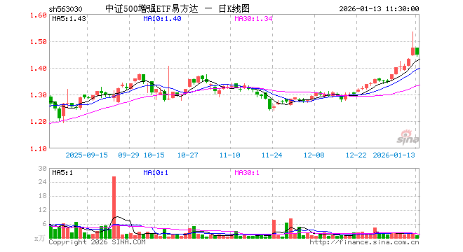 中证500增强ETF易方达(563030)业绩比较基准为中证500指数收益率,管理人为易方达基金管理有限公司,基金经理为官泽帆,成立(2023-02-17)以来回报为46.42%,近一个月回报为11.72%。