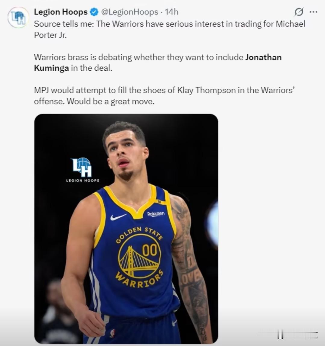 勇士新三巨头诞生库里、巴特勒、小波特!新水花兄弟库里和小波特! 勇士又犯老毛病了,去年2月份的时候,顶薪拿下巴特勒,这次又梭哈掘金不要的小波特! 美媒NBA记者Brett Siegel报道:勇士已经正式向篮网提供了对于小波特的报价,具体交易筹码是库明加、穆迪、巴迪希尔德加1 个首轮选秀权! 这个报价已经非常丰厚了!据说篮网队是想要2个首轮,双方目前还在拉扯! 这份报价对于勇士来说已经是顶价了,不能再高了!一年半之前,勇士提供的这份报价都能得到马尔卡宁了,但现在勇士这套筹码贬值相当厉害! 而勇士队即便得到小波特,这套阵容想要争冠也非常难! 目前勇士内线4号位和5号位只能指望老格林,霍福德和波斯特!老的老小的小!打到季后赛的话,内线大概率是不够的! 希望小波特能扮演克莱汤普森的角色,亦或是杜兰特加汤普森合体的角色,给库里拉开空间,组成新水花兄弟! 当然勇士队还有筹码,还有三个首轮,看后续勇士队的运作吧!