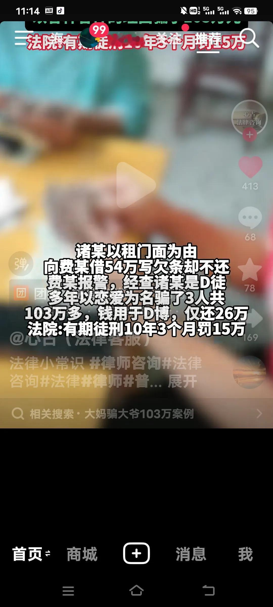 56岁的大妈为偿还赌债,与3名70多岁的大爷谈恋爱,诈骗103万,仅还26万。最终被判处10年3个月有期徒刑,还需缴纳15万罚金。实在令人费解,何苦要做这害人害己之事呢? 评论区有网友说,不知这位大妈能否熬过十年,要是熬不过去该怎么办?确实如此,倘若死在监狱里,说不定还会讹上法律。 类似的情况并不少见,那些不走正道的人,骗到钱又有何用呀?既害了他人,也毁了自己,真搞不懂他们是怎么想的,甚至还连累孩子名声受损,真是让亲戚朋友颜面尽失!