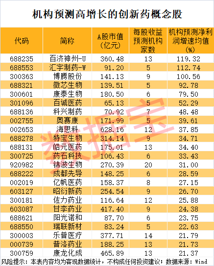 从未来增长潜力来看,根据5家以上机构一致预测,2026年、2027年净利润增速均有望超20%的创新药概念股有23只。