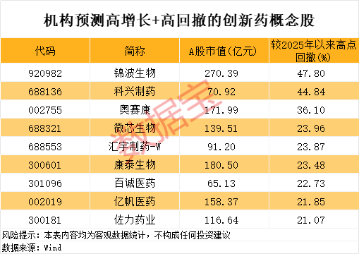 股价表现方面,上述23只高增长潜力的创新药概念股中,截至1月12日收盘,最新收盘价较2025年以来高点回撤20%以上的有9只,包括锦波生物、科兴制药、奥赛康、微芯生物、汇宇制药-W等。