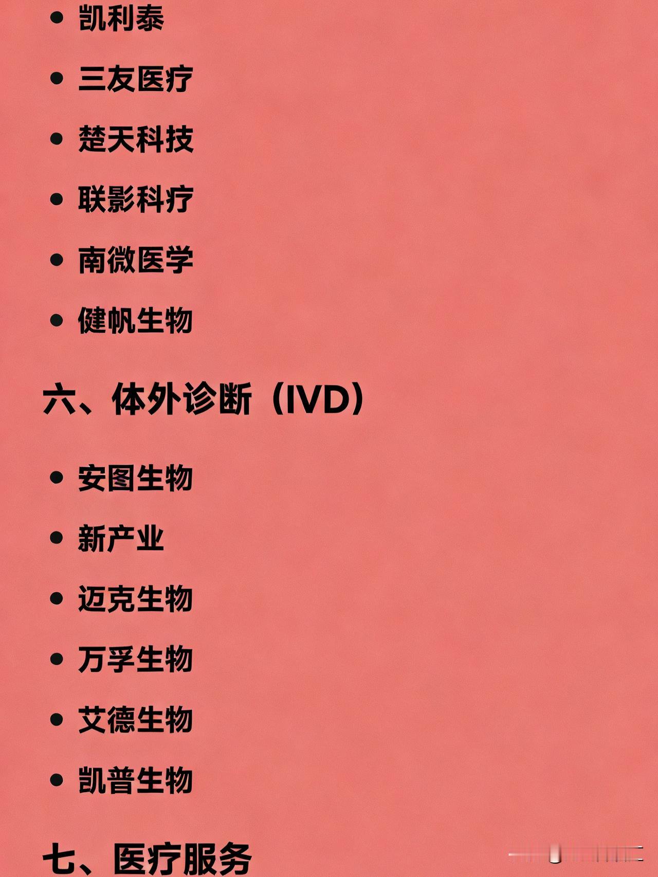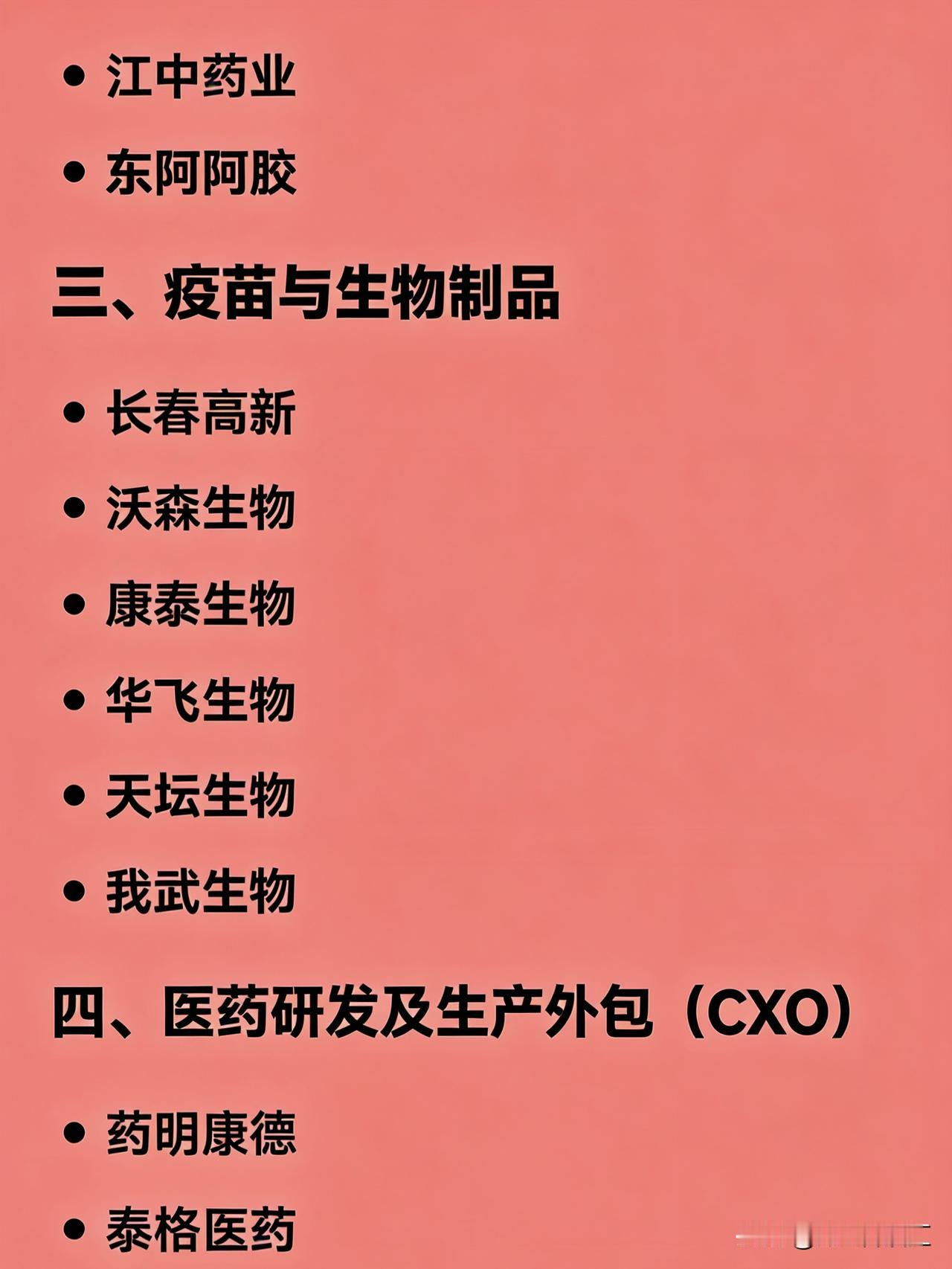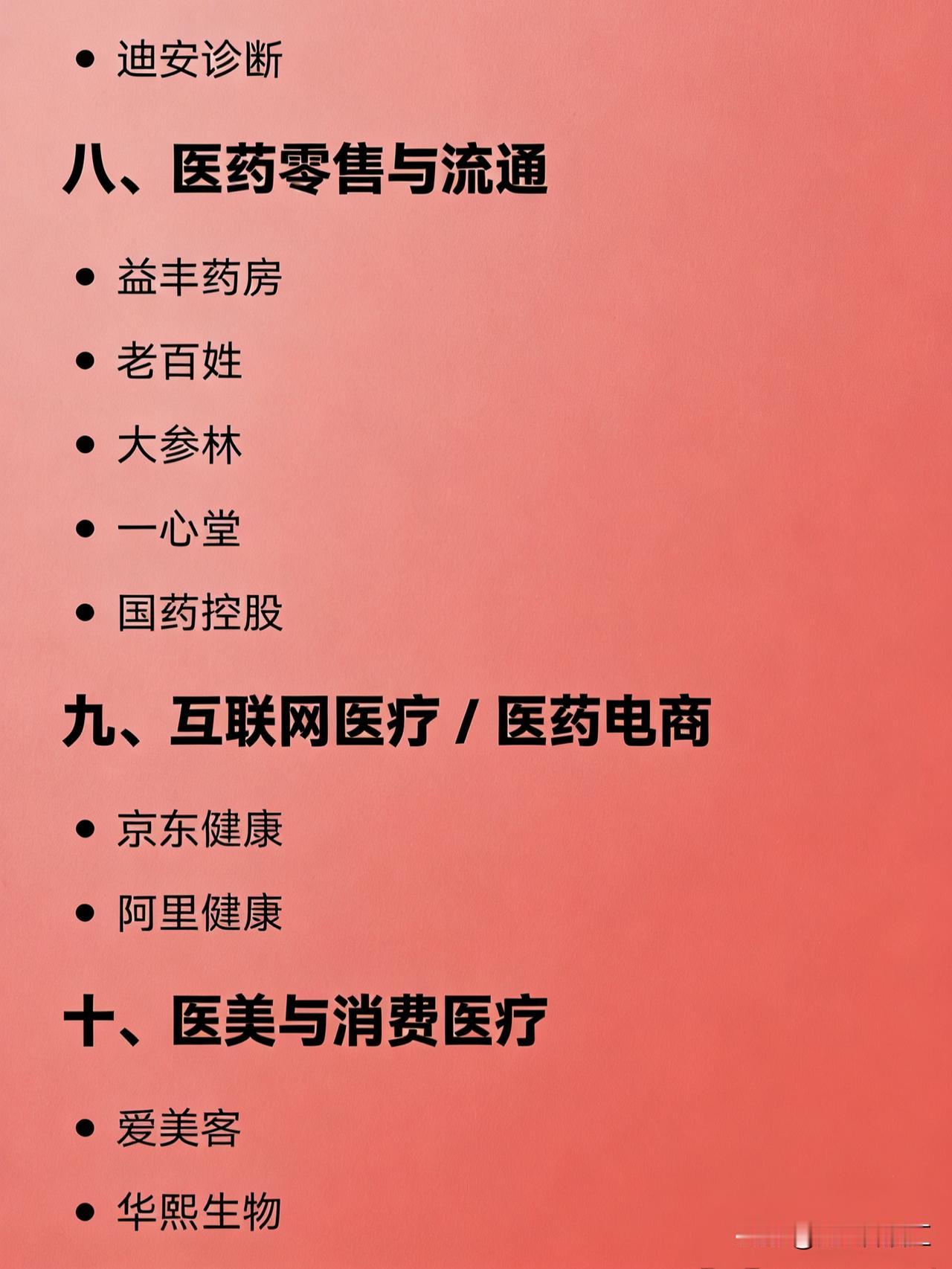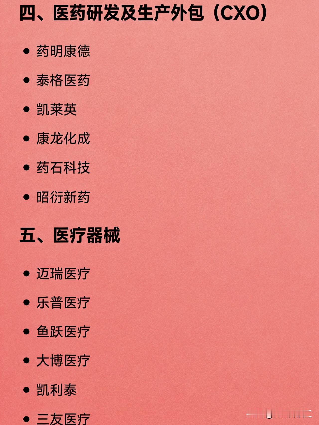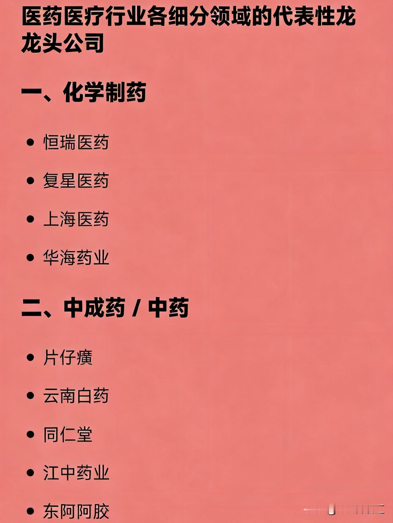 医药医疗行业各细分领域的代表性龙头公司 创新药研发:恒瑞医药 创新药出海:百济神州 ADC药物:荣昌生物、科伦药业 GLP-1减肥药:信达生物、华东医药 CXO(医药外包):药明康德 临床CRO:泰格医药 小分子CDMO:凯莱英 医疗器械全品类:迈瑞医疗 高端医学影像:联影医疗 家用医疗器械:鱼跃医疗 心血管器械:乐普医疗 骨科器械:大博医疗、威高骨科 体外诊断(IVD):安图生物 基因检测:华大基因 第三方医学检验:金域医学、迪安诊断 疫苗:智飞生物、长春高新 血液制品:华兰生物、天坛生物 中成药:片仔癀、云南白药 中药现代化:同仁堂、以岭药业 眼科医疗服务:爱尔眼科 口腔医疗服务:通策医疗 医美注射材料:爱美客 玻尿酸全产业链:华熙生物 医药零售连锁:益丰药房、老百姓、大参林 医药商业流通:上海医药、国药控股 一、化学制药 恒瑞医药 复星医药 上海医药 华海药业 二、中成药 / 中药 片仔癀 云南白药 同仁堂 江中药业 东阿阿胶 三、疫苗与生物制品 长春高新 沃森生物 康泰生物 智飞生物 华兰生物 天坛生物 我武生物 四、医药研发及生产外包(CXO) 药明康德 泰格医药 凯莱英 康龙化成 药石科技 昭衍新药 五、医疗器械 迈瑞医疗 乐普医疗 鱼跃医疗 大博医疗 凯利泰 三友医疗 楚天科技 联影医疗 南微医学 健帆生物 六、体外诊断(IVD) 安图生物 新产业 迈克生物 万孚生物 艾德生物 凯普生物 七、医疗服务 爱尔眼科 通策医疗 美年健康 锦欣生殖 金域医学 迪安诊断 八、医药零售与流通 益丰药房 老百姓 大参林 一心堂 国药控股 九、互联网医疗 / 医药电商 京东健康 阿里健康 十、医美与消费医疗 爱美客 华熙生物