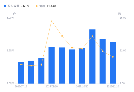 日期A股户数(户)流通A股户均持股数(股)户均持股市值(万元)2026-01-092690434222.5340.692025-12-102628835024.4640.072025-11-282679134366.8741.072025-11-202824832594.2743.452025-10-202542436214.7244.152025-09-302519136549.6844.882025-09-192549236118.1148.292025-09-102557536000.9053.072025-08-082389238536.8741.272025-07-312348739201.3941.67