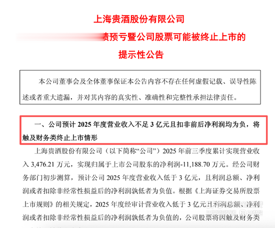 1月12日晚,*ST岩石(即上海贵酒)披露,公司预计2025年度营业收入不足3亿元且扣非前后净利润均为负,将触及财务类终止上市情形。