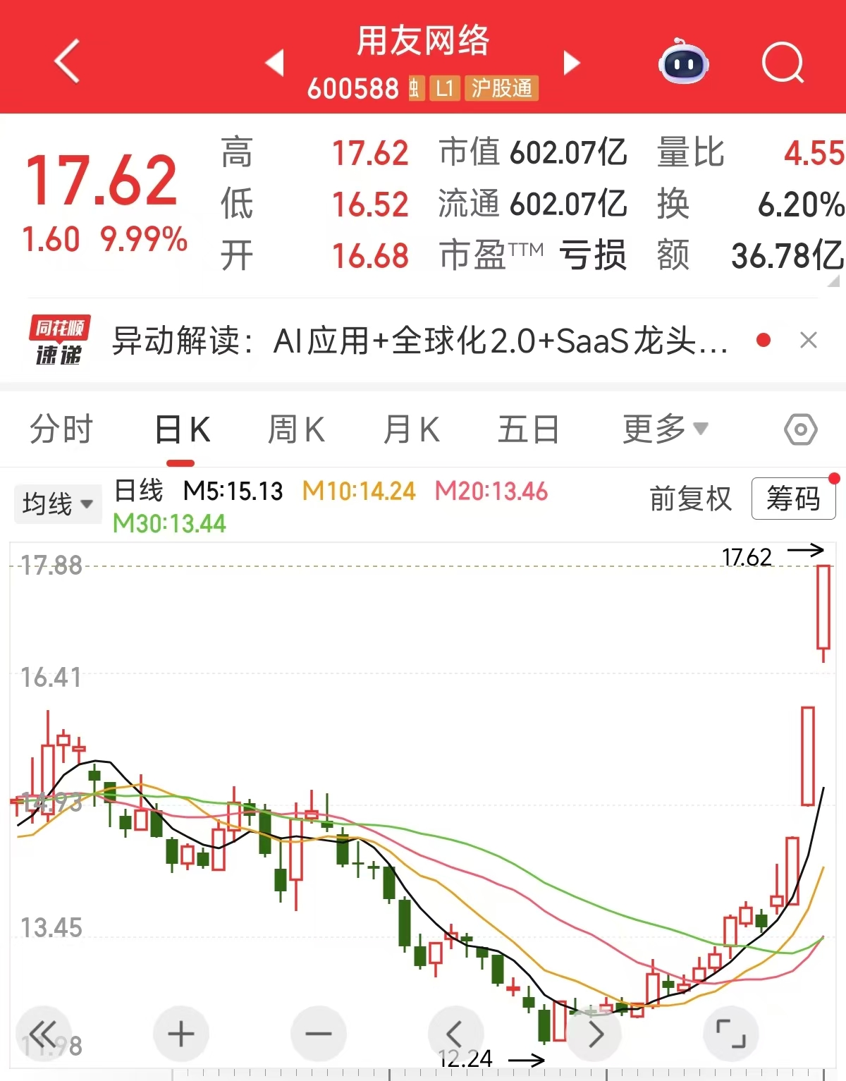 个股异动 | 用友网络2连板 与化工企业签约AI平台项目