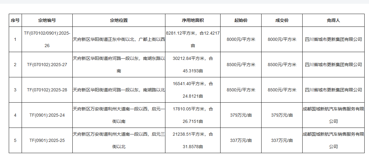 根据出让结果,3宗涉宅地均由四川省城市更新集团有限公司以底价收入囊中,另外2宗商业用地由成都国城新航汽车销售服务有限公司以底价拿下。