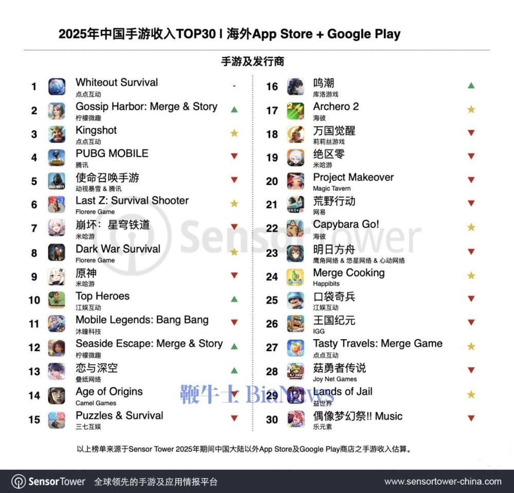 而到了出海手游收入榜上,点点互动《WhiteoutSurvival》2025年海外收入显著上涨32%,超过16.5亿美元,蝉联2025年出海手游收入榜冠军。美国、韩国和日本市场合计贡献64%的海外总收入。