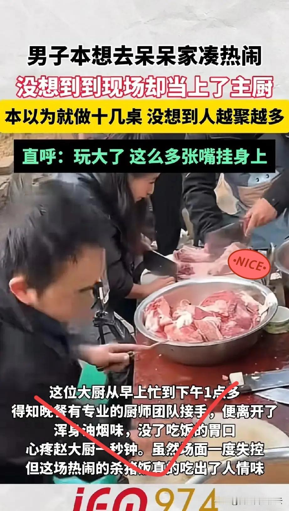 杀猪宴惊现“最强义工”!重庆赵大厨比呆呆还惨,忙到饭都没吃上! 本来只是去凑个热闹,瞅着人多就主动露手艺,赵大厨怕是没想到自己会从早忙到下午一点。铲子抡冒烟,满脑子都是“不能让大家饿肚子”,结果专业厨师团队来接班时,他累得满身油烟味,连吃饭的心思都没了。 这哪是凑热闹,简直是义务掌勺的“冤种大厨”!热心肠真的不分职业,赵大厨这份不计回报的帮忙,比杀猪宴的肉还让人觉得暖心。呆呆家必须单独安排一顿答谢宴,不然真说不过去。