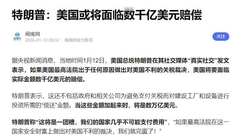 特朗普:完蛋了! 当地时间1月12日,特朗普终于坐不住了,在社交媒体发出了如上的“惊呼”。 这位向来强硬的前总统,这回是真的坐不住了,字里行间满是紧张,而让他乱了阵脚的,正是1月14日最高法院要对他任内关税政策作出的判决结果。 这可不是小事,一旦判决对他不利,美国政府要面临的麻烦远比想象中更大,特朗普甚至直言国家可能都扛不住。 这事的根源得从特朗普第二届任期上台后的关税操作说起。2025年1月重返白宫后,他没跟国会商量,直接援引《国际紧急经济权力法》发布行政令,一口气推出了一系列加征关税的措施。 先是对加拿大、墨西哥的进口商品加征25%关税,对中国输美商品加征10%关税,后来又加码到对所有进口钢铁、铝征收25%关税,甚至对进口汽车及核心部件也开出了25%的关税单,对华累计关税一度冲到了145%。 他想靠这种强硬手段扭转贸易逆差、推动制造业回流,却忽略了一个关键问题:征税权本是国会的核心权力,总统靠宣布“国家紧急状态”绕过国会加征关税,在法律上站不住脚。 果然,政策一出美国国内就炸了锅。2025年4月,5家小企业和12个州直接把联邦政府告上了法庭,质疑这套关税政策违法。 案件一路上诉,美国联邦巡回上诉法院和国际贸易法院先后都裁定特朗普政府的关税政策无效,无奈之下,特朗普政府只能向最高法院提起上诉,这才有了1月14日的关键判决。 更让特朗普揪心的是,2025年11月最高法院举行听证会时,多数大法官就对他的做法持怀疑态度,连保守派大法官都忍不住质疑,要是国会能把关税权交给总统,那是不是连外交、宣战权都能拱手相让,本质上就是不认可他越权行使权力。 特朗普之所以喊着“完蛋了”,核心就是怕判决不利带来的巨额赔偿。按照他自己的说法,一旦最高法院判输,美国政府首先要面临数千亿美元的退税赔偿。 而根据业内估算,仅需要退还的关税金额就落在1335亿到1500亿美元之间,要是再算上逾期的利息,这笔钱只会更多。 但特朗普觉得这还只是冰山一角,实际要付出的会是数万亿美元,因为这里面还得加上联邦政府和相关企业为避开关税、专门砸钱建工厂、添设备的投资“偿还”费用。 这些投资可不是小数目,最典型的就是台积电的案例。为了换取美国降低针对台湾地区商品的关税,台积电承诺在美国亚利桑那州追加巨额投资,计划再建至少五座芯片厂,加上之前已经敲定的投资,总金额能达到2650亿美元。 要知道,一座芯片厂的建设成本就超过200亿美元,而且美国本土人力、折旧成本远高于其他地区,台积电在美国工厂的毛利率只有8%,远低于台湾本土的62%,这些投资本就是靠着关税优惠才勉强推进的。 一旦关税政策被推翻,这些为避税而进行的投资就成了“无用功”,特朗普认为政府得为这些投资买单,这笔账一算下来,数额就直奔数万亿美元了。 对特朗普来说,这不仅是钱的问题,更是牵一发而动全身的乱局。他直言“这将是一团糟,我们的国家几乎不可能支付费用”,绝非危言耸听。美国政府本就面临财政赤字压力,上千亿甚至上万亿的赔偿和偿还费用,无疑会让财政雪上加霜。 更关键的是,这套关税政策是他重返白宫后核心的经济举措,一旦被最高法院否定,不仅意味着他的贸易政策彻底破产,还会厘清美国行政权和立法权的边界,未来总统再想靠行政令操控关税就难了,这对正谋求政治影响力的特朗普来说,无疑是沉重打击。 其实特朗普政府也不是没留后手,财政部长贝森特和国家经济委员会主任哈塞特都透露,要是判决不利,会动用其他权力复制关税政策,维持收入水平,只是其他方法远比现在的方式烦琐,效果也不确定。 但特朗普很清楚,后手再周全,也挡不住短期的巨额支出和政策崩塌的影响。毕竟最高法院的裁决不仅决定关税政策的存废,还会影响全球贸易秩序,一旦判他败诉,之前被加征关税的商品价格可能回落,进口商纷纷上门退税,美国国内产业链、供应链也会跟着动荡。 这也是特朗普为何如此紧张的原因,他喊“完蛋了”,既是怕巨额费用拖垮国家财政,也是怕自己的政治遗产和未来的政治路被彻底堵死。从听证会大法官们的态度来看,他胜诉的概率本就不高,这才有了1月12日的慌乱惊呼。 说到底,这场危机都是他自己越权操作埋下的隐患,关税政策看似强硬,却忽略了法律边界和经济规律,如今要面临最高法院的终极裁决,无论结果如何,美国都要为这场任性的贸易操作付出代价,而特朗普口中的“完蛋了”,不过是对这场危机最直白的焦虑宣泄。