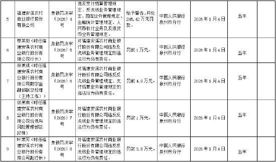 1月13日金融一线消息,中国人民银行泉州市分行行政处罚决定信息公示表显示,福建安溪农村商业银行因违反支付结算管理规定、反洗钱业务管理规定、国库业务管理规定、金融统计管理规定、人民币收付业务及反假货币业务管理规定,被中国人民银行泉州市分行给予警告,并处245.42万元罚款。