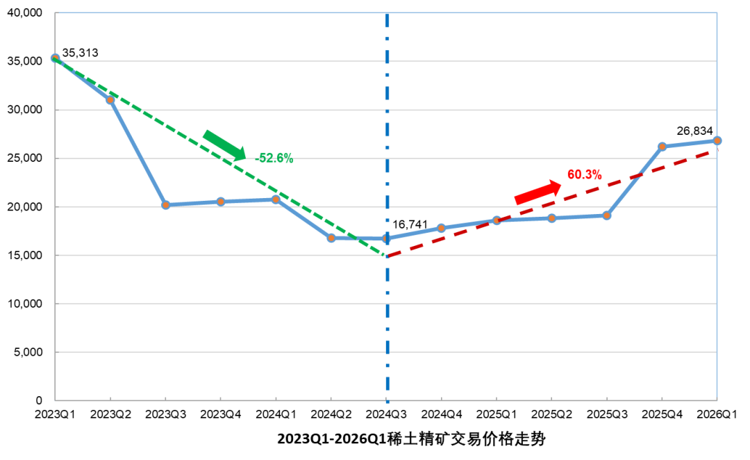 1月9日,包钢股份、北方稀土同步发布公告,公告显示。2026年一季度稀土精矿不含税价格升至26834元/吨(干量,REO=50%),较2025年四季度环比上涨2.4%,较2025年同期同比增长44%;若回溯至2024年三季度的价格低谷(16741元/吨),累计涨幅已达60%,实现连续六个季度的稳步上调,稀土精矿价格的连续上调,在一定程度上反映出全球能源转型与地缘政治重构背景下,稀土行业供需格局、技术壁垒与全球话语权的深刻变革。