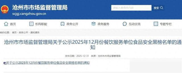 为规范高速服务区(停车区)、车站及景区周边、特色餐饮服务企业(火锅鸡、驴肉火烧、羊肠汤)、无堂食外卖等重点领域餐饮服务秩序,沧州市市场监督管理局近日公布了2025年12月份餐饮服务单位食品安全黑榜名单。